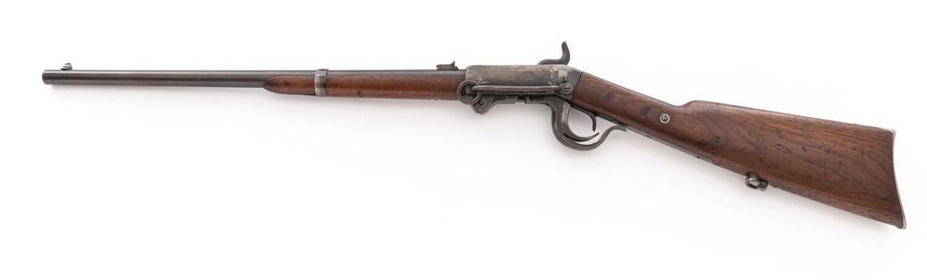 Civil War Burnside Breechloading Percussion Carbine, 5th Type, #10468, .54 cal., 21" round barrel marked "Cast Steel 1864" and "H", with standard carbine sights; receiver with curved trigger guard/operating lever, marked "Burnside's Patent/Model 1864/10468" at front and several inspectors' marks, has sling ring/bar at left; back-action lock and military hammer are both marked "H". Oil-stained walnut forend has single band, matching buttstock with 2 "G.C." cartouches of Inspector George Curtis at left wrist has semi-crescent buttplate (marked "C"), swivel at belly. Mfg'd 1864. Condition is fine retaining good traces of blue, mostly silvered case colors, else smooth gray/brown gunmetal with sharp edges and markings. Stocks are sound and smooth (.75" ding at forend) with a large "A" carved at right, clear cartouches, pleasing added oil finish. Action is crisp, bore is bright with sharp rifling. Est.: $1,800-$2,400. (Antique)
