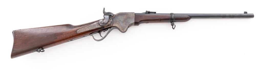 Civil War Spencer Model 1865 Saddle Ring Carbine, #20359, .52 Spencer cal., 20" round barrel marked "M 1865" at breech has standard carbine sights; receiver has maker's name, address, 1860 patent date and serial number at top, hammer marked "W", saddle ring/bar at left. Oil-finished walnut forend (marked "P") has single band with sling swivel, matching buttstock a crescent buttplate with removable 7-shot cartridge magazine tube, swivel at belly, "E.A.W." (E.A. Williams) and "D.A.P." (Dwight A. Perkins) inspectors' cartouches at left wrist. Mfg'd ca. 1863-65. Condition is near excellent retaining approx. 97% original military blue to barrel, lovely mottled case colors, smooth gunmetal having sharp edges and markings. Stocks are sound showing occasional light dings, sharp cartouches, pleasing color and finish. Action is crisp, original 6-groove bore is bright with sharp rifling and light frosting toward muzzle. Est.: $2,500-$3,500. (Antique)