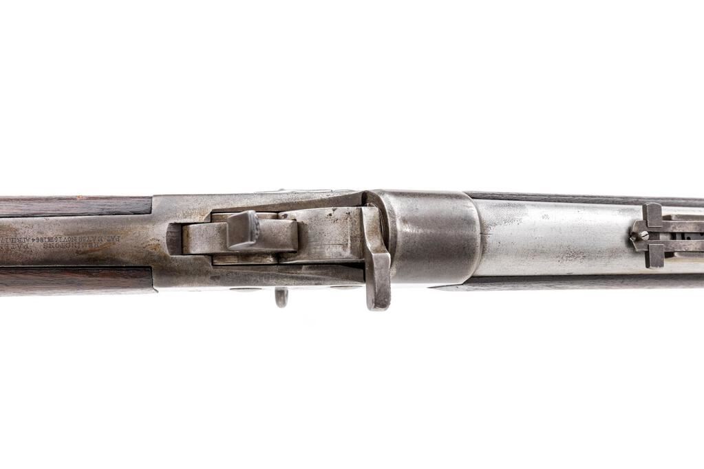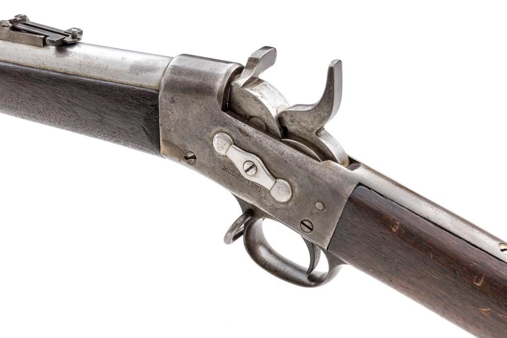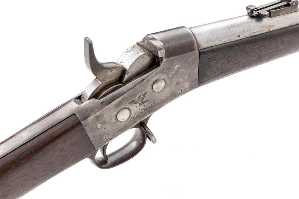 Antique U.S. Springfield Model 1871 Remington Rolling Block Single-Shot Infantry Rifle, NVSN, .50 CF cal., unmarked 36" round barrel has block-blade front (also bayonet lug) and folding-leaf rear sights; large receiver has central hammer and rolling breechblock with auto-extraction, is marked "Model 1871" at left, "(spread-wing federal eagle"/U.S./Springfield/1872" right, "Remington's Patent" and 1864-68 patent dates at top tang, has loop trigger guard with sling swivel. Oil-stained walnut forestock has 2 spring-retained bands (top with sling swivel), nosecap, slotted/grooved ramrod, matching buttstock with curved buttplate marked "US" at top. Mfg'd ca. 1871-72. Condition is very good showing clean bright metal, muted/silvered case colors, sharp edges and markings. Stocks are sound, fit "proud", show much original "feathering", dings and shallow gouges of military use. Action is crisp, bright bore shows overall frosting, sharp rifling. Est.: $800-$1,200. (Antique)
