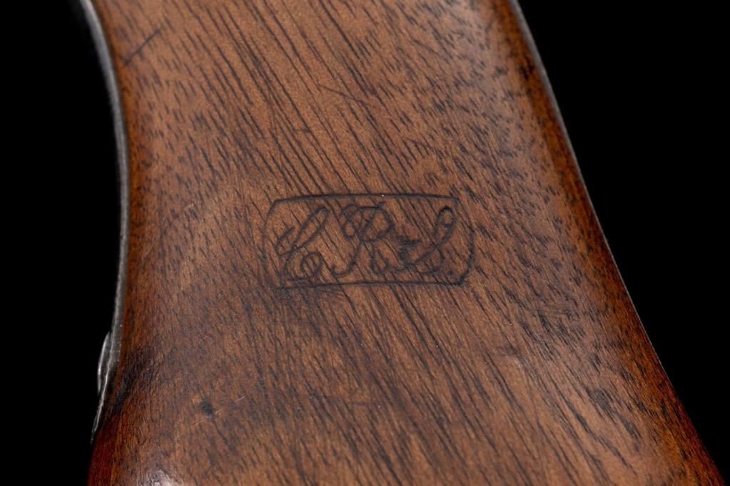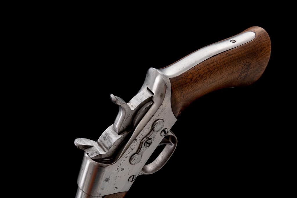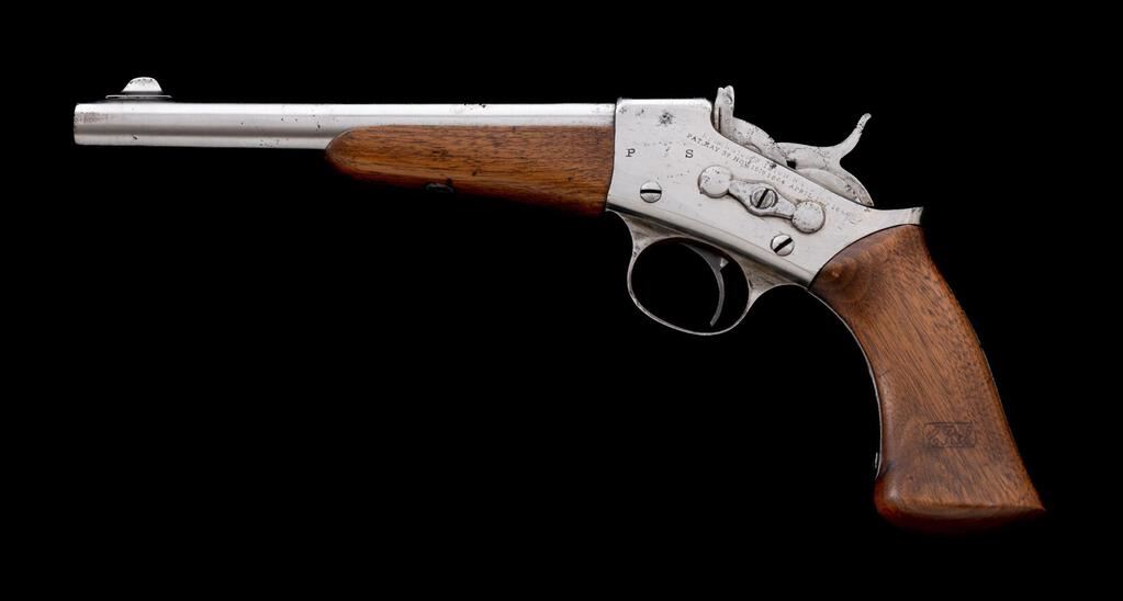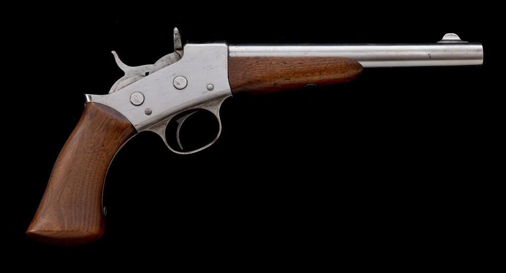 Remington Model 1871 Army Single-Shot Rolling Block Pistol, NVSN, .50 CF cal., unmarked 8" round barrel has raised blade front sight; receiver marked with maker's name, address,1864-66 patent dates, and "P S" at left has rolling breechblock with auto-extraction, integral trigger guard, "saw-handle" strap, 2-pc. oil-finished walnut forend and grip with "C.R.S." (Curtis R. Stickney) inspector's cartouche at left. Mfg'd. ca. 1872-88, just 6K qty. Condition is good retaining no original finish but bright metal having sharp edges and markings, smooth unmarked wood with clear cartouche. Action is crisp, bright bore has cleaned light frosting and sharp rifling. Est.: $1,000-$1,500. (Antique)