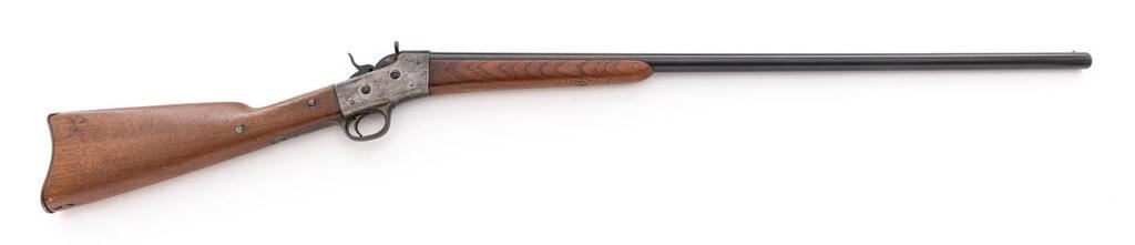 Rare Whitney-Remington Type II Rolling Block Shotgun, #84885, 20 ga., 32" tapering round barrel has shotgun-style bead front sight; rolling-breechblock receiver marked "Whitney Arms Co./Whitneyville, CT, U.S.A." at top tang, serial number below, with auto extraction. Oil-finished walnut forend/buttstock, carbine buttplate. Mfg'd 1881-88 in less than 1,000 qty. Condition is very good retaining approx. 85% thinning and toning barrel blue, silvering case colors, sharp edges and markings. Stocks are sound and smooth, there being a secure 4" hairline at left comb reinforced by two thru-rivets. Action is frozen, breechblock may have had a repair, clean bore shows overall light frosting. This shotgun is a very rare Whitney rolling block variation. Est.: $600-$800. (Antique)