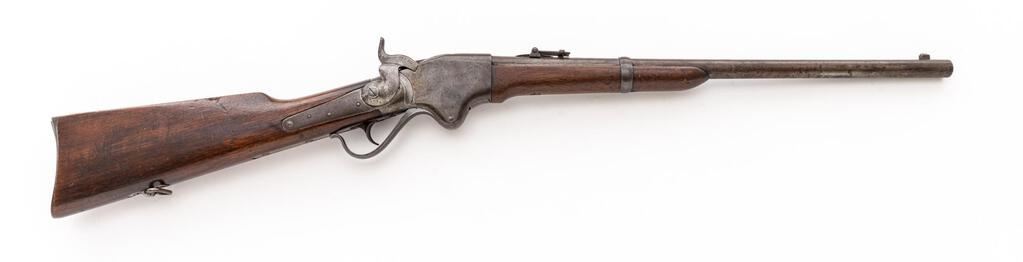 Civil War Spencer Saddle Ring Carbine, #57360, .52 RF cal., unmarked 22" round barrel has standard carbine sights; receiver has the maker's name, address, 1860 pat. date and serial number at top, saddle ring/bar at left. Oil-finished walnut forend has single band, matching buttstock a crescent buttplate with removable 7-shot cartridge magazine tube, sling swivel at belly, "S.W.P." (Samuel W. Porter) and "D.A.P." (Dwight A. Perkins) inspectors' cartouches at left wrist. Mfg'd ca. 1863-65. Condition is very good retaining no original blue, silvered case colors, generally smooth gray/brown gunmetal (barrel shows scattered light oxidation) with fine edges and markings. Stocks are sound showing occasional light marks and dings, legible cartouches. Action is crisp, original 6-groove bore is bright with sharp rifling and very light frosting. Est.: $1,800-$2,400. (Antique)