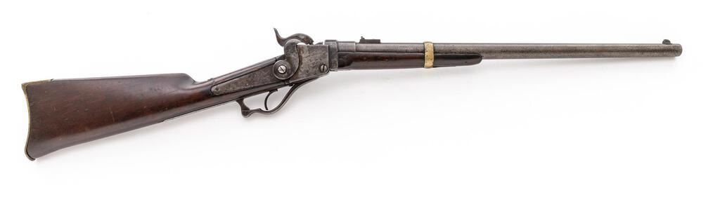 Civil War Starr Breechloading Percussion Carbine, NVSN, .54 cal., 21" round barrel with standard carbine sights, marked "Starr Arms Co., Yonkers, N.Y."; receiver marked "Starr's Patent/Sept. 14tg, 1858" at breech, has trigger guard/operating lever, sling ring at left, back-action lockplate marked "B"/Starr Arms Co./Yonkers, N.Y."; 2-pc. halfstock has single brass forend band, brass buttplate. Mfg'd ca. 1862-65. Condition is good retaining traces of original blue, else gray gunmetal showing scattered light etching (bit of pitting at right-side receiver/hammer) with fine edges and markings, brass with age patina. The sound buttstock shows a break repair at wrist, 2.5" hairline cracks either side of comb, 2" smoothed area of missing wood at toe, forend with dings and shallow gouges at bottom of frame. Action is crisp, bore shows scattered light-to-moderate erosion toward muzzle, else sharp rifling. Est.: $1,200-$1,800. (Antique)