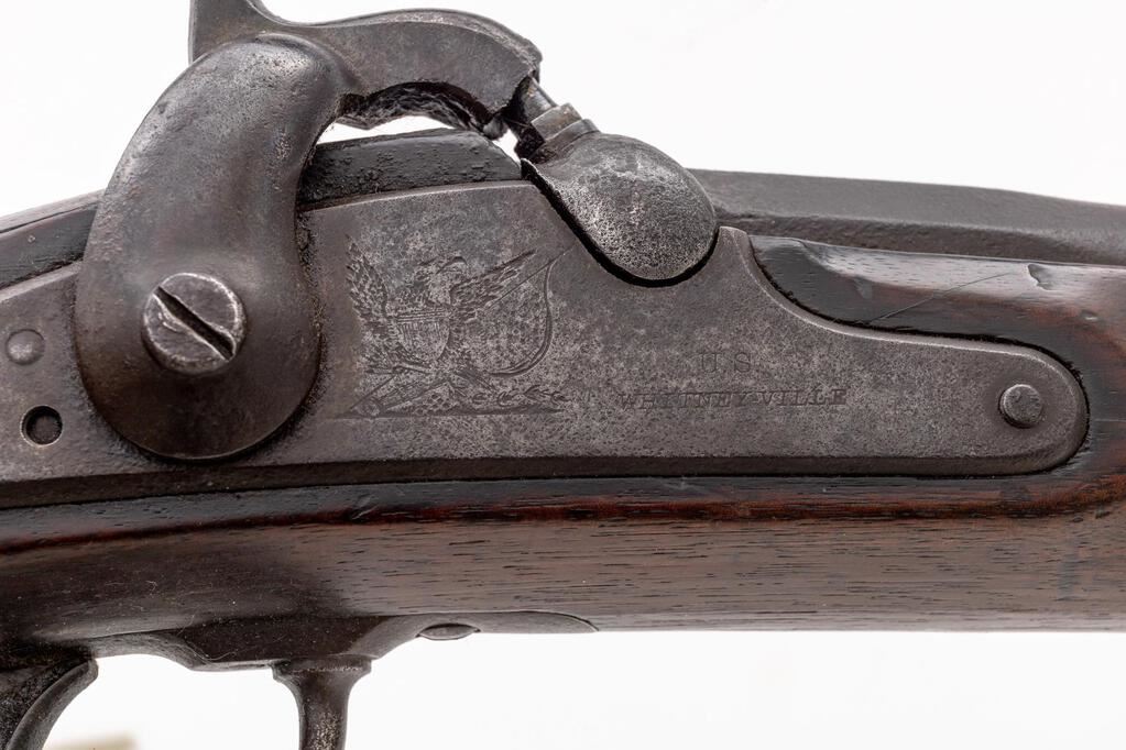 Civil War Whitney U.S. Navy Model 1861 Percussion "Plymouth" Rifle, #2990, .75 cal., 34.25" round barrel has blade front, long-range rear sight graduated to 1,000 yds., 3.6" bayonet lug at right muzzle, "2990" at tang; beveled lockplate has large "(spread-wing eagle/flag)" and "U.S./Whitneyville" below bolster, "1863" vertically at rear; iron fittings include 2-pc. trigger guard with finger-spur, curved buttplate marked "US" at top, 2 bands (lower with swivel, upper of the double-strap type retaining the barrel-tip ramrod). Stock of oil-finished black walnut has swivel at belly. Mfg'd 1863. Condition is good, the barrel deep brown showing general oxidation (pitting at breech obscuring markings there), else gray/brown gunmetal with good edges and markings. Stock is sound and smooth showing oval "FCW" cartouche of inspector Frank C. Warner (light but present) opposite lock, scattered marks, chipping in ramrod channel. Action is smooth, smoothbore shows deep erosion. Est.: $1,000-$1,500. (Antique)