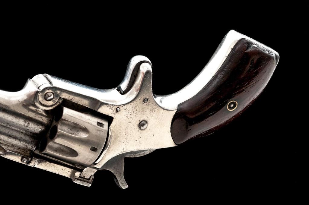 Osgood Gun Works Duplex Over/Under Revolver, NSNV, .22 cal. Upper/.32 cal. Lower ribbed barrel, 2.5" ribbed tip-down barrels, blade front and fixed rear sights, nickel finish, spur trigger, smooth wood two-piece square butt grips, 8-shot cylinder for .22 barrel and single shot cylinder for .32 barrel. Top of the barrel rib is marked "PAT'D DEC. 7 1880"; top strap is marked "DUPLEX". Left side of the lower barrel is marked "OSGOOD GUN WORKS NORWICH, CONN." Revolver is in near fine overall condition retaining a significant amount of frosted nickel finish, with light surface erosion and edgewear. Hammer and trigger show old muted case hardening. Smooth wood grips are very good with a couple small dents at the base of each grip. Bores are fair with some roughness, and the action functions well on this unique antique revolver. Est.: $700-$900. (Antique)