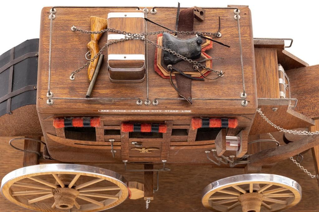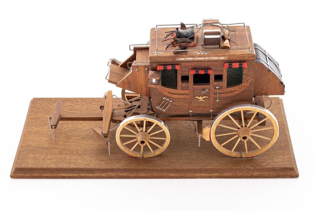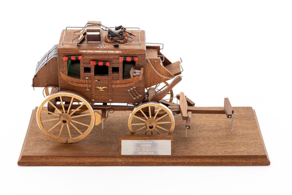 Miniature Stagecoach, marked on plaque "1973 National Governor's Conference, Governor, Jack Williams, Lake Tahoe, Nevada", approx. 17"x8", on wooden base.  Shows excellent detail with accoutrements such as miniature shotgun, trunk and saddle on top.  Stagecoach is marked "Lake Tahoe - Carson City Stage Line".  Condition is excellent.  Est.:  $500-$700.