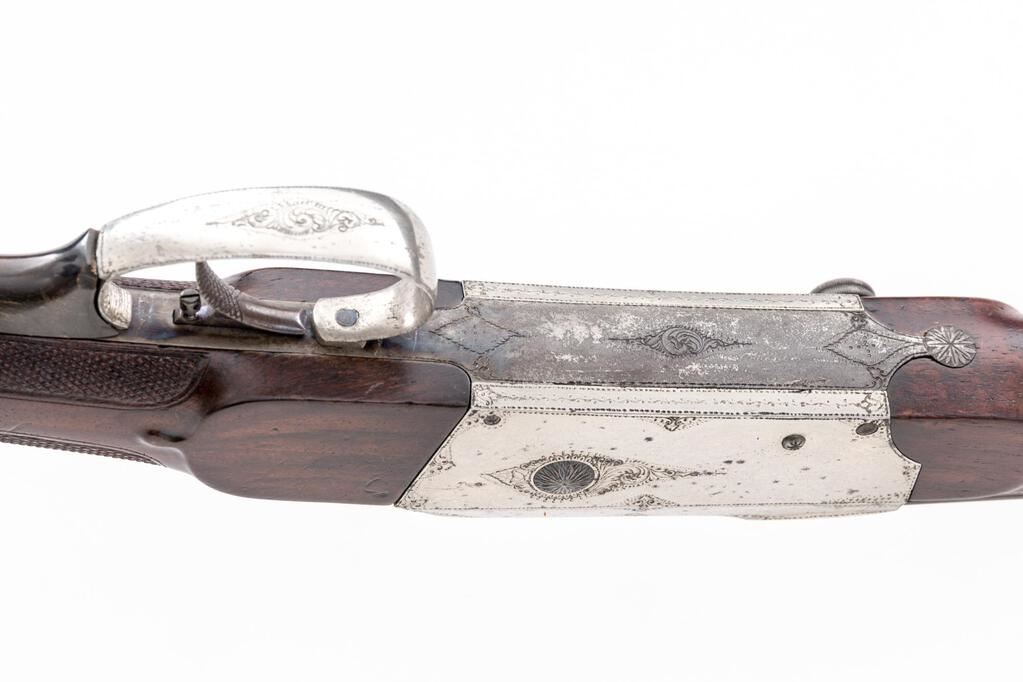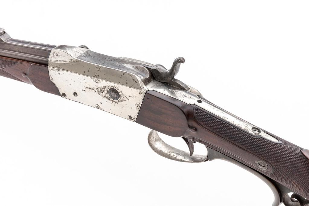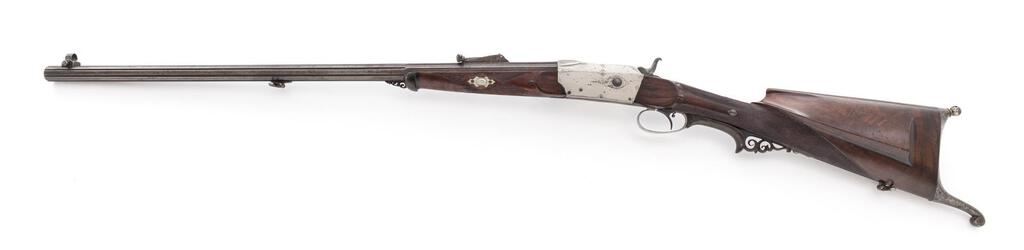 Antique Single-Shot Martini Type Schuetzen Target Rifle, by Olsen-Maseng of Askim, Norway, NVSN, 8mm CF cal., 29'' deeply-fluted octagonal barrel has hooded Beach front and elevation adjustable sliding-leaf rear sights, silver-inlaid "Olsen-Maseng, Askim" at breech; nickel-plated and engraved receiver has 180-degree lever at right that drops open the case hardened breechblock, right-offset hammer, adjustable single set trigger. Top tang threaded for sight (not present). Finely carved and checkered walnut buttstock and forend have scroll-carved horn trigger guard and Schnabel cap, steel Swiss buttplate having removable ball-tip rod. Condition is fine retaining approx. 80% thinning and toning blue to barrel, 92% original toning and lightly flaking nickel to receiver and trigger guard. Stock is sound and smooth showing sharp checkering and carving, lovely grain, color and satin finish. Action is crisp, bright bore shows light frosting and sharp rifling. An unusual and rare Norwegian-made Schuetzen rifle. Est.: $1,800-$2,400. (Antique)
