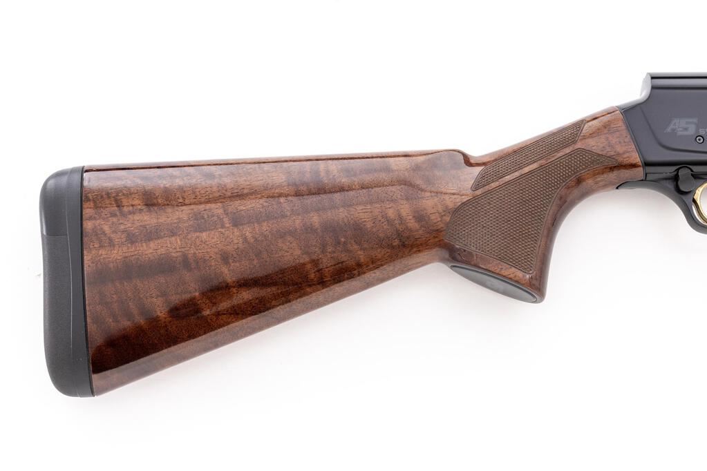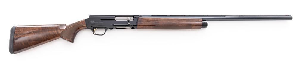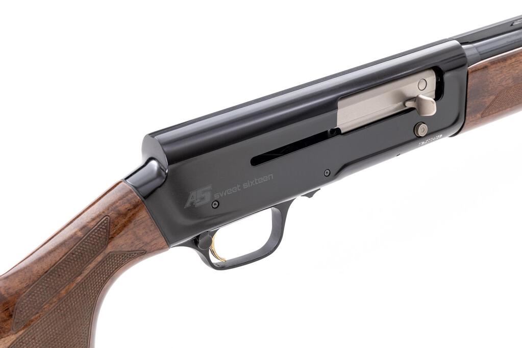 Browning New Design Auto-5 "Sweet Sixteen" Model Semi-Automatic Shotgun, #116ZT14158. 16 ga. 28" vent rib barrel has target beads, 2-3/4" chamber, and is fitted for Invector choke tubes (IC installed). The action is gas operated, similar to the Benelli system; the receiver is dark anodized alloy with Browning logos. The slender forend and full pistol grip buttstock are high-gloss finished, dark "B" Grade walnut, with distinctive checkering, A5 grip cap, and "Inflex" recoil pad. Stock dimensions are 14-3/8"x1-7/8"x2-1/8". Mfg'd 2016. Condition is excellent, approx. 95%, with little wear to action, which functions correctly, and there are almost no marks to the wood. Bore is bright. A very nice, fast-handling field gun. Est.: $1,000-$1,200. (Modern)