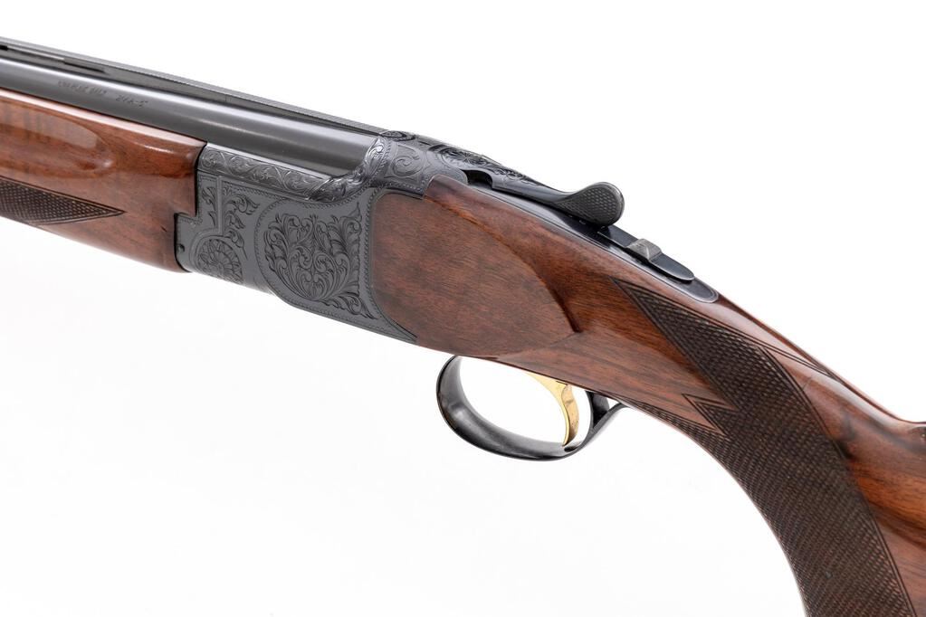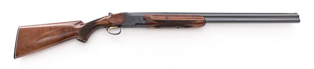 Charles Daly/Miroku Venture Skeet Grade Over/Under Shotgun, #523088. 20 ga. 26" narrow vent rib barrels have target beads, 3" chambers, and are choked Skt/Skt. The boxlock action is similar to a Browning Citori, and features a gold single selective inertia trigger, non-automatic safety, and auto ejectors. The blued receiver is nicely hand-engraved in floral patterns with punch-dot borders. The finger groove semi-beavertail forend and pistol grip buttstock are "B" Grade walnut, high-gloss finished, with adequate checkering, Whiteline black plastic grip cap, and "B.C. Miroku" marked buttplate. Stock dimensions are 14"x1-1/2"x2-1/2". Mfg'd late 1960s by Miroku in Japan for Charles Daly. Condition is near excellent, approx. 95%, showing very little use. Action still locks tight and functions correctly, except that the lower ejector will operate on opening even if the trigger is not pulled, which can be repaired by a qualified gunsmith. Little wear to checkering; bores are bright. Est.: $900-$1,100. (C&R)