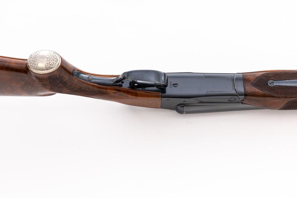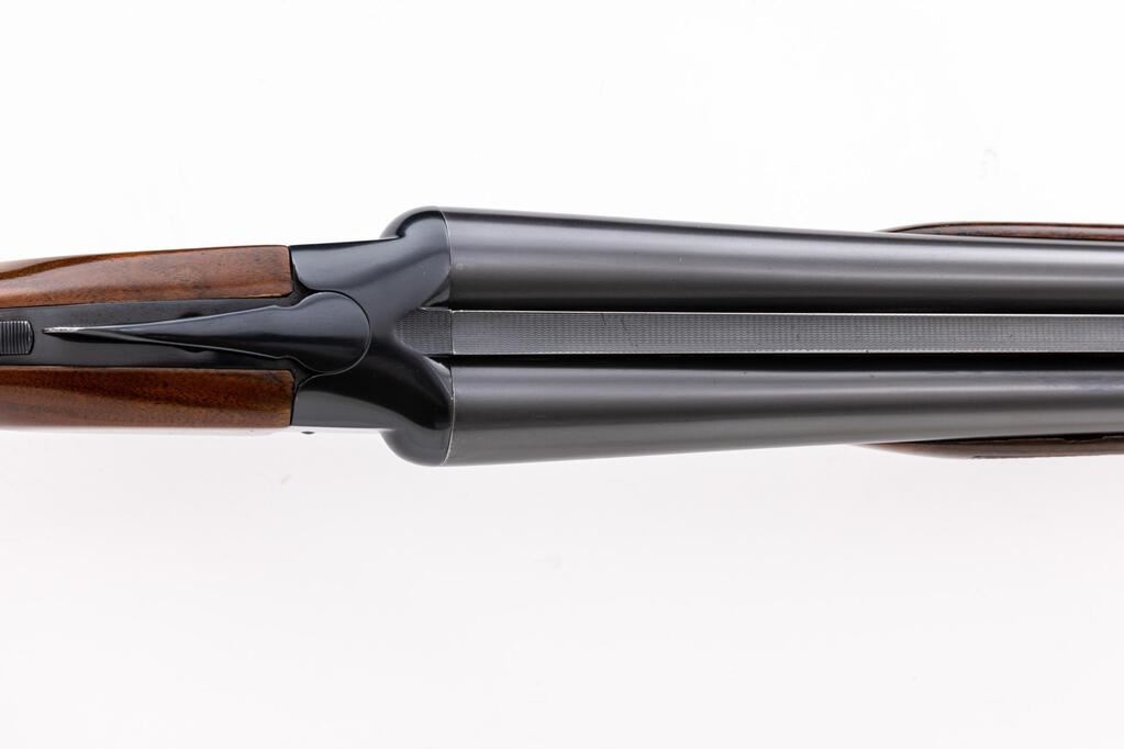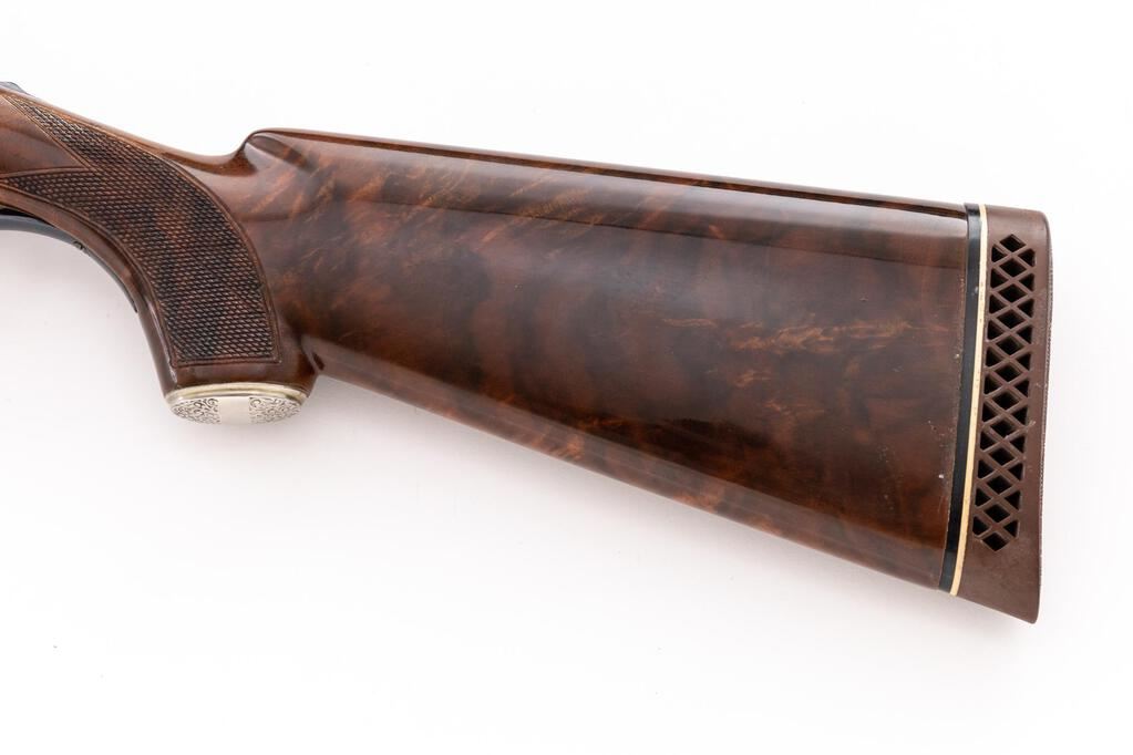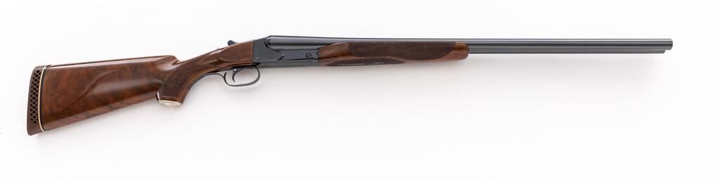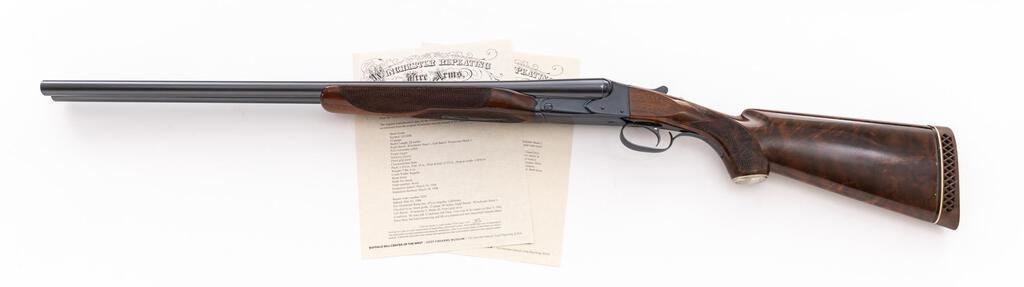 Winchester Model 21 Skeet Grade Side-by-Side Shotgun, #19544. 12 ga. 28" solid rib barrels have target beads, 2-3/4" chambers, and are choked WS-1/WS-2. The boxlock action has a single underlug lockup, single selective mechanical trigger, non-automatic safety, and auto ejectors. The blued receiver is unengraved but marked "Skeet" forward of the trigger guard. The beavertail forend and pistol grip buttstock are of "C" Grade walnut, high-gloss finished and fully checkered, with unengraved metal grip cap and Pachmayr Whiteline butt pad fitted. Stock dimensions are 14-1/2"x1-5/8"x2-3/8". Mfg'd 1948. Includes a letter from Winchester/Cody Firearms Museum that describes original condition and subsequent repairs. Condition is very good to near excellent as modified with upgraded wood and probable re-blue. Wood has very few handling marks, metal has little wear. Action locks tight and functions correctly; bores are bright. Still a very nice Skeet gun. Est.: $3,500-$4,000. (C&R)