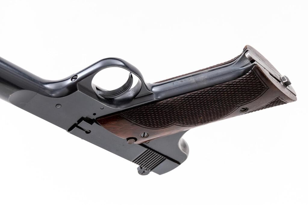Hi-Standard Model E Semi-Automatic Pistol, #36464, .22 L.R. cal., 6.75" heavy bull barrel, blade front and square notch adjustable rear sights, blue finish, deluxe checkered walnut target two-piece target grips with a thumb rest on the left panel, and one correct two-tone 10-rd. magazine. Left barrel lug is marked "MADE IN U.S.A./THE HIGH STANDARD MFG. CO./NEW HAVEN CONN." Mfg'd 1938. Pistol is in near fine overall condition retaining approx. 90%-92% factory blue finish with some thinning of finish at the muzzle, highpoint edgewear, and on the grip straps. Grips are very good showing some flattening to the checkering and flea bite compressions at the bases with a good look. Action is crisp, bore is very good. The Model E was a high-quality deluxe model of the hammerless series with a total production of approx. 2,600 units. Est.: $700-$900. (C&R/PPT)