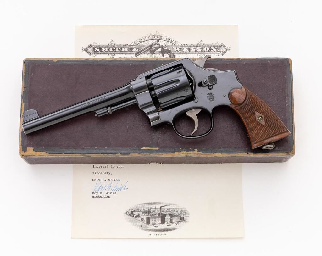 Smith & Wesson .44 Hand Ejector Second Model Double Action Revolver, #20828, .44 S&W Spec. cal., 6.5" barrel, blue finish, checkered diamond center walnut grips, lanyard ring, round blade front sight, standard notched rear sight, smooth color case hardened trigger, and checkered hammer. Frame and yoke with matching assembly numbers (84510). Barrel, cylinder, and extractor are numbered to the gun. One of the Second Model .44 Hand Ejectors that was built on a 1917 frame with "(eagle's head)" inspection mark on the inside, near the assembly number. Shipped to S.C. Melzer & Co., August 14, 1923; with factory letter signed by S&W Historian Roy G. Jinks. Letter does not specify any of the revolver's features. In unnumbered one-piece maroon "Patent/Display" box. Condition is very good retaining approx. 92%-94% factory blue. Metal with tiny nicks and scratches from handling and use. There is mild pitting visible on the left side of the frame, as well as some small specks to the right side. Factory lettering is clear. Approx. 55%-60% muted case colors remain. Grip checkering is primarily sharp, smooth borders show a small amount of typical light handling marks, no major blemishes. Action cycles smoothly and locks up securely. Bore is very good, bright, rifling is clearly defined. Box shows edgewear and a gouge to top of the lid, end label is clear. Est.: $1,500-$1,800. (C&R/PPT)