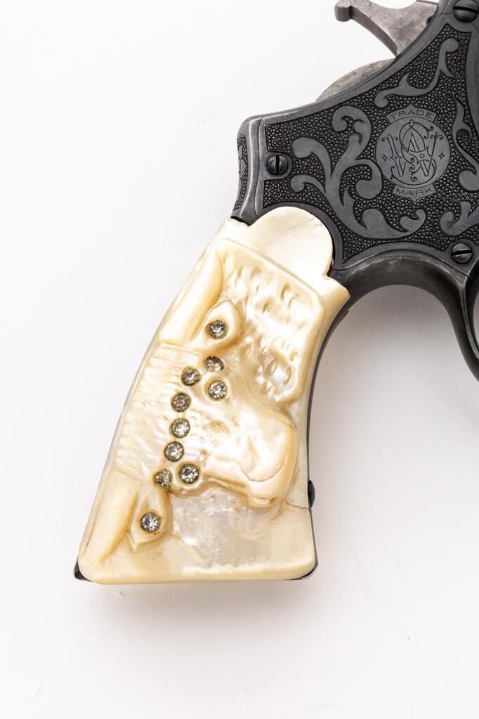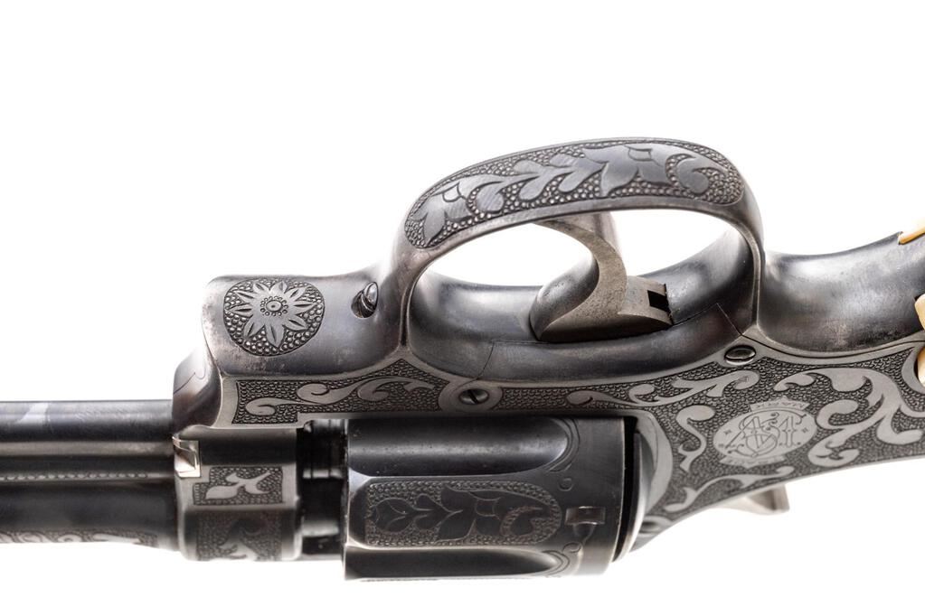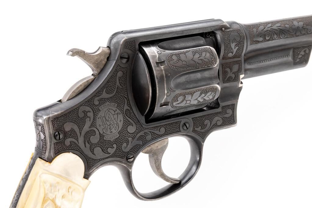 Engraved Smith & Wesson .44 Hand Ejector First Model (Triple-Lock) Double Action Revolver, #2268, .44 S&W Spec. cal., 7.5" pinned barrel, blue finish, pearl grips; right grip with a carved steers head that is adorned with several small clear gemstones at the eyes, ears, and across the forehead. This revolver also features a round blade front and standard notched rear sights, color case hardened hammer and smooth trigger. Nicely accomplished non-factory engraving covers approx. 70% of the metal surfaces. Engraving includes scroll and floral motifs set against a punch-dot background. Work is not signed. Frame and yoke with matching assembly numbers (4011). Barrel, cylinder, yoke lock and extractor are numbered to the gun. Shipped to Schoverling Dale & Gale Co., New York City, NY, Nov. 18, 1908, with factory letter signed by S&W Historian Roy G. Jinks. Letter verifies barrel length, finish, and the original grips are listed as checkered walnut. Condition is very good overall retaining approx. 90% low luster finish. Wear at the muzzle, lower portion of the frame/trigger guard, and front strap accounts for much of the finish loss. Factory lettering is clear, and engraving is crisp. There are intermittent tiny pin prick blemishes present on parts of the metal, as well as a few small mars to the left side of the front sight blade. Only trace amounts of case coloring remain, and there is very mild pitting visible on the sides of the trigger. Both grips show moderate yellowing and have a nice, aged appearance. Left grip fits just a little small with a small chip at the heel, and a vacant spot at the upper edge that likely held some sort of decorative medallion. Right grip fits better, carving is defined, with a tiny chip at the toe and a little larger chip missing from the heel, as well as a small age crack in between the steer's mouth and grip edge. Action cycles smoothly and locks up securely. Bore shows moderate wear, is clean, lands and grooves are clearly defined, but there are a few small spots of erosion approx. 2" down from the muzzle. Est.: $2,000-$3,000. (C&R/PPT)