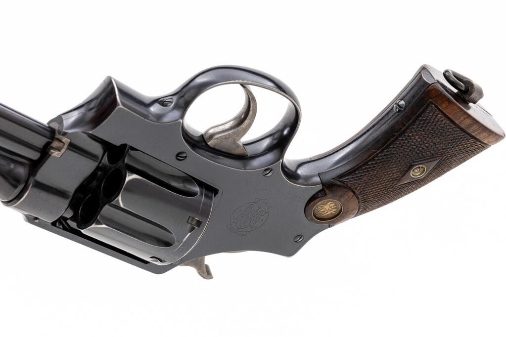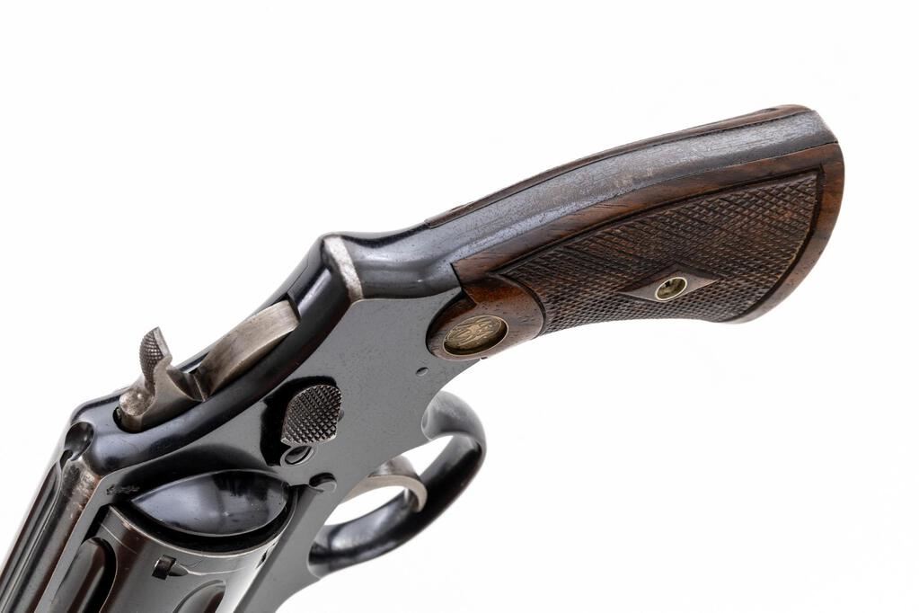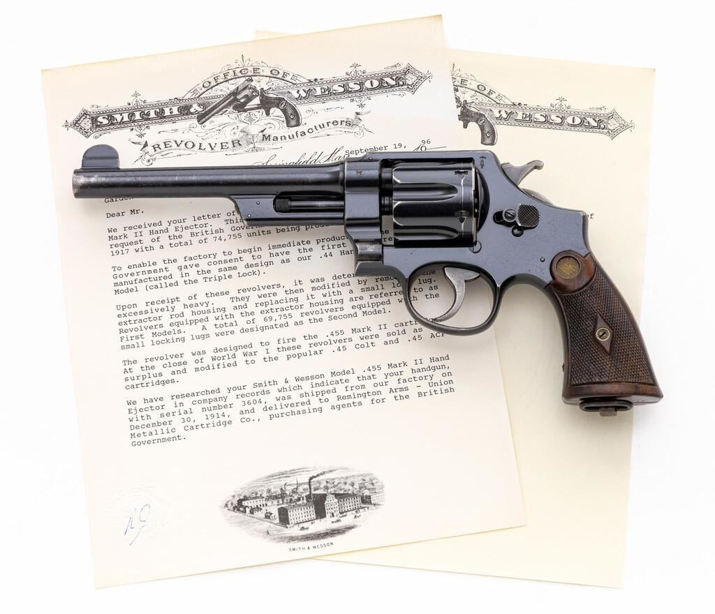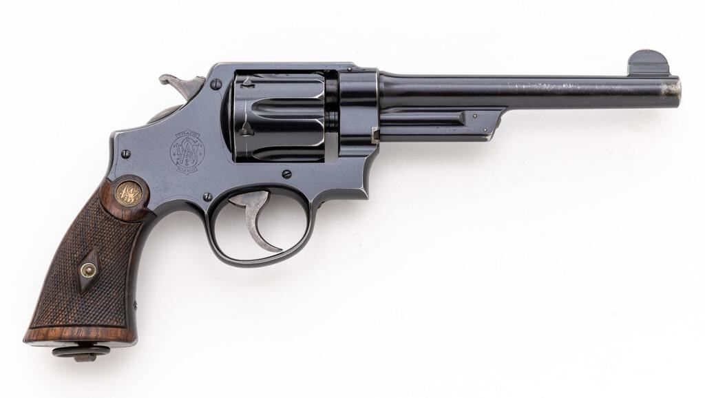 British Contract Smith & Wesson .455 Hand Ejector First Model (Triple Lock) Double Action Revolver, #3604, .455 Mark II cal., 6.5" pinned barrel, blue finish, checkered diamond center walnut grips with S&W medallions, round blade front sight, notched rear sight, color case hardened hammer and trigger, lanyard loop in butt. British proof marks on left side of frame and back of the cylinder. Barrel address is located on top of barrel, which has no other markings. Frame and yoke with matching assembly numbers (2758). Barrel, cylinder, yoke lock and extractor are numbered to the gun. Back of the right grip is hand numbered in pencil and matches the revolver. Shipped to Remington Arms - Union Metallic Cartridge Co., purchasing agents for the British Gov't, Dec. 30, 1914; with factory letter signed by S&W Historian Roy G. Jinks. Letter does not specify any of the revolver's features. Condition is very good retaining approx. 70% original factory blue. Metal shows general age and wear. Losses and patina to sides of the barrel, top of frame, and backstrap accounts for much of the finish loss; backstrap shows additional frosting. Factory lettering and proof marks are clear. Hammer and trigger retain approx. 60% muted case colors. Grip checkering is primarily crisp with a few handling marks to the smooth borders, medallions show moderate toning from age. Action cycles smoothly and locks up securely. Very good bore, bright, lands and grooves are clearly defined, no frosting or erosion. Est.: $1,200-$1,500. (C&R/PPT)
