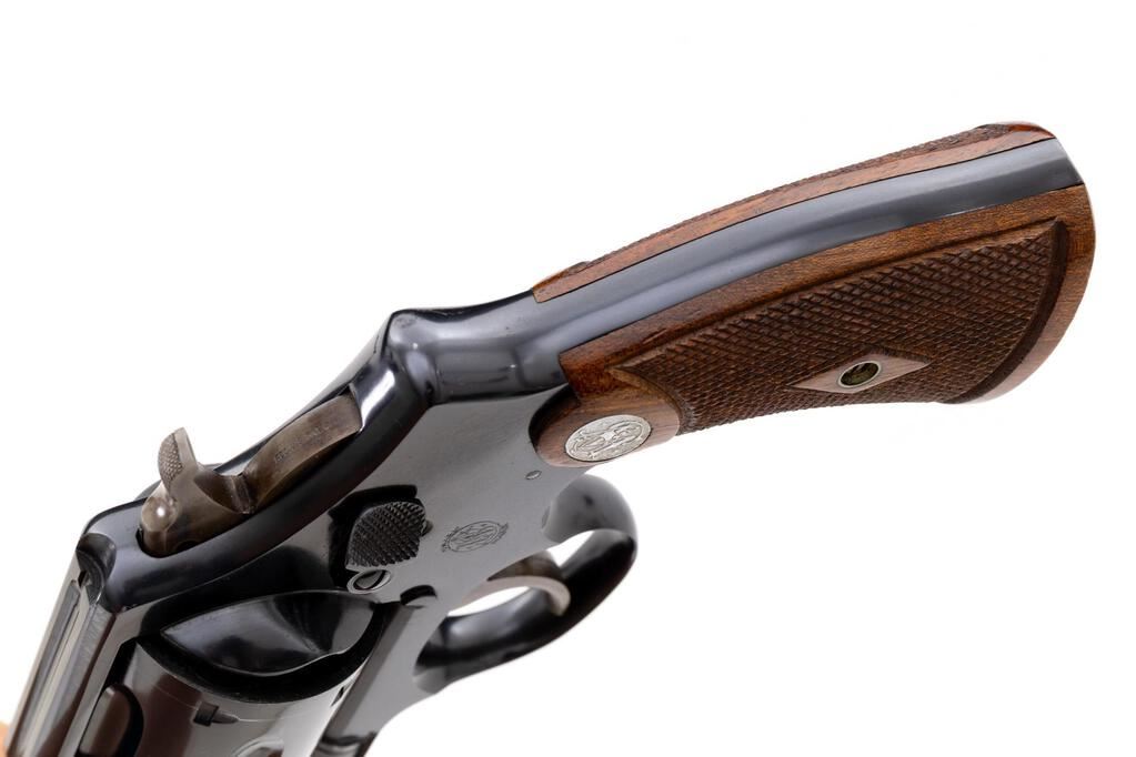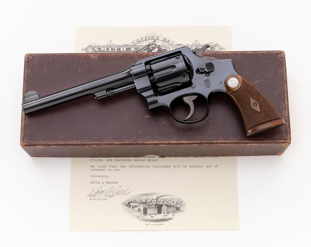 Smith & Wesson .44 Hand Ejector Second Model Double Action Revolver, #36622, .44 S&W Spec. cal., 6.5" barrel, blue finish, checkered diamond center walnut grips, round blade front sight and standard notched rear sight, serrated color case hardened trigger, and checkered hammer. Frame and yoke with matching assembly numbers (84855). Barrel, cylinder, extractor, and back of right grip are numbered to the gun. Shipped to Harper & Reynolds Co., Jan. 28, 1933; with factory letter signed by S&W Historian Roy G. Jinks. Letter verifies barrel length, finish, and type of grips. In one-piece maroon "Patent/Display" box, bottom is numbered in pencil and matches the revolver. Condition is fine retaining approx. 92%-94% factory blue. Metal with tiny nicks and scratches from handling and use, predominantly on the muzzle end of the barrel and cylinder. Muzzle wear and a visible index line to the cylinder accounts for much of the finish loss. Factory lettering is clear. Approx. 75%-80% case colors remain. Grips are near excellent, checkering is sharp, smooth borders have a few shallow impressions, no major blemishes. Action cycles smoothly and locks up securely. Strong bore, bright, with well-defined rifling. Box shows general scuffs and scratches, end label is clear, corners are intact. Est.: $1,600-$2,200. (C&R/PPT)