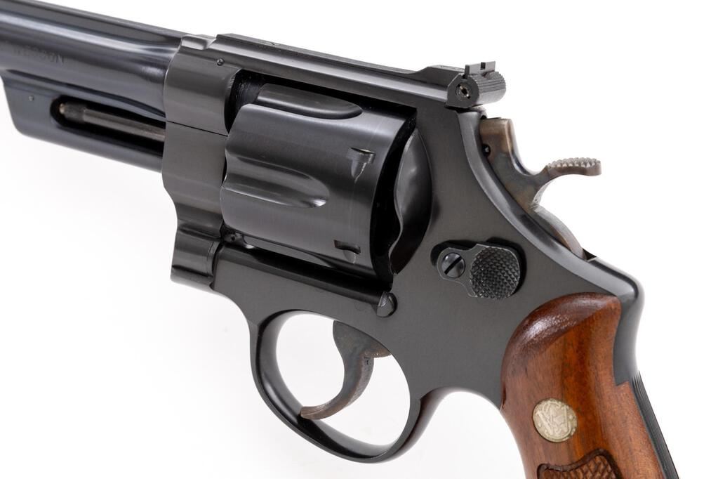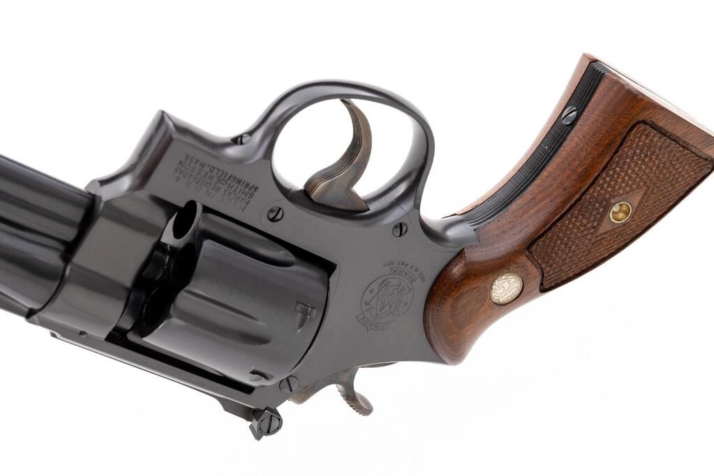 Excellent Smith & Wesson .44 Hand Ejector 4th Model Target (Model of 1950/Pre-Model 24) Double Action Revolver, #S144700, .44 S&W Spec. cal., 6.5" pinned barrel, blue finish, checkered diamond center walnut grips with S&W medallions, Patridge front sight, square-notch fully adjustable rear sight, color case hardened .265 serrated trigger and .400" target hammer. Frame and yoke with matching assembly numbers (59755). Barrel, cylinder, extractor, and right grip are numbered to the gun. Shipped to Sloan's Sporting Goods, New York, NY, April 25, 1955; with factory letter signed by S&W Historian Roy G. Jinks. Letter verifies barrel length and finish. In unnumbered two-piece blue box with silver lettering. Condition is excellent retaining approx. 98%+ blue. There is some light wear visible on the front sight and a very faint index line to the cylinder. Factory lettering is clear. Case colors are strong, approx. 99% remain. Grips are like new with sharp checkering. Action cycles smoothly and locks up securely. Bore is bright with well-defined rifling. Box shows typical light storage type wear, lettering is clear, metal reinforced corners are intact. Est.: $1,600-$2,200. (C&R/PPT)