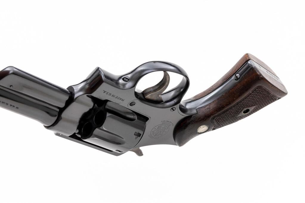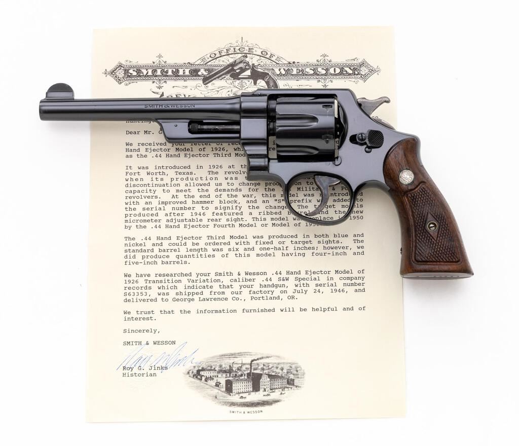 Factory Refinished Post-War Smith & Wesson .44 Hand Ejector Third Model (Model of 1926 Transition Variation) Double Action Revolver, #S63353, .44 S&W Spec. cal., 6.5" pinned barrel, blue finish, checkered diamond center walnut Magna grips with S&W medallions, round blade front and standard square-notched rear sights, with a color case hardened hammer and trigger. Frame and yoke with matching assembly numbers (4803). Barrel, cylinder, extractor, and back of right grip are numbered to the gun. Shipped to George Lawrence Co., Portland, OR., July 24, 1946; with factory letter signed by S&W Historian Roy G. Jinks. Letter does not specify any of the revolver's features. There are small "(diamond)" rework marks stamped on the barrel and cylinder. Left side of the grip frame is marked with a "(boxed)R-S" refinish mark and a date of 4/73. Metal surfaces rate in about fine overall condition, as refinished, approx. 96% blue remains, with a little mild frosting to the backstrap. Light scratching to the trigger guard and muzzle wear accounts for most of the finish loss. Factory lettering is clear. Only trace amounts of case coloring remain on the hammer. Case colors on the trigger are primarily vibrant, but there is some mild pitting visible on the left side and face. Grips show general age and handling wear but remain serviceable. Right grip is darker in color; left grip shows more thinning and finish loss. There are a few spots of mild rust to the sides of the grip frame, under the grips. Action cycles smoothly and cylinder locks up well, with just a little rotational movement. Bore is very good, bright with well-defined rifling, and a few minor spots of fouling in the grooves. Est.: $1,500-$1,800. (C&R/PPT)
