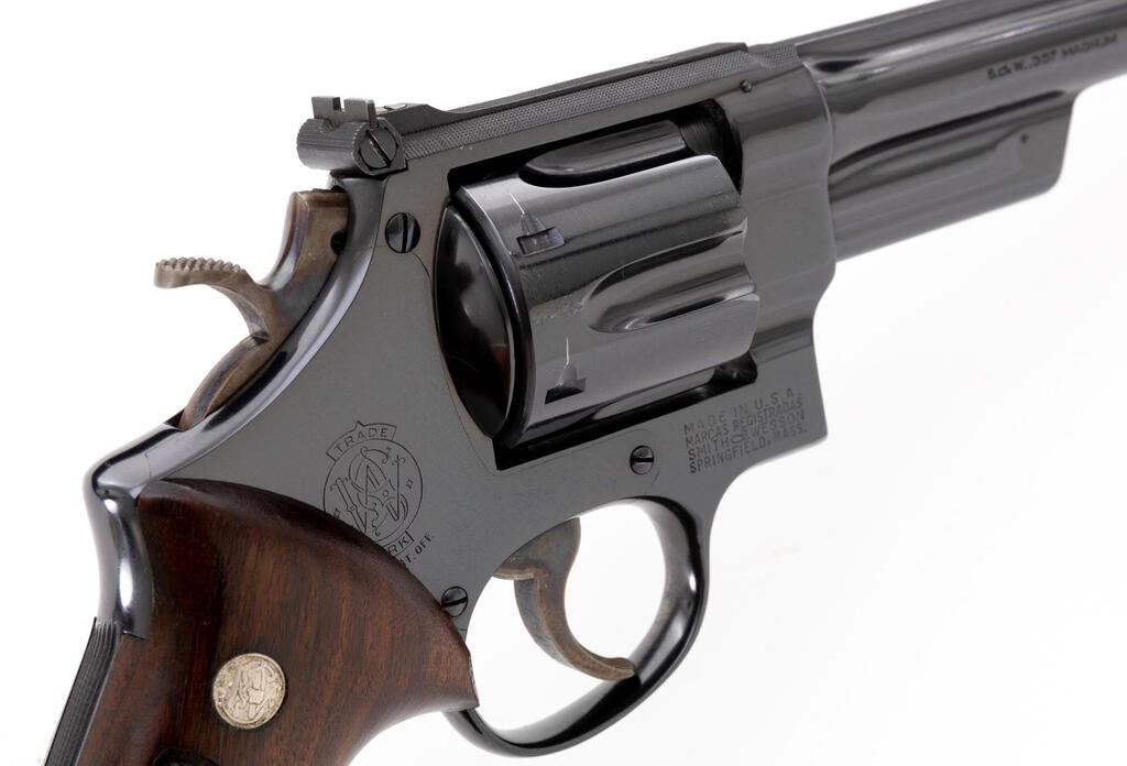 Smith & Wesson .357 Magnum (Pre-Model 27) Double Action Revolver, #S162635, 8-3/8" pinned barrel, checkered diamond center walnut target grips with S&W medallions, Patridge front sight, square-notched fully adjustable rear sight, color case hardened serrated trigger and checkered hammer. Frame and yoke with matching assembly numbers (15998). Barrel, cylinder, and extractor are numbered to the gun. Shipped to Harris & Stroh, San Francisco, CA, Jan. 26, 1956; with factory letter signed by S&W Historian Roy G. Jinks. Letter verifies barrel length and finish. In a two-piece gold box, bottom is faintly numbered and not completely legible in black grease pen but does not match this revolver. Condition is near excellent retaining approx. 95% factory blue. There is light wear at the muzzle and thin index line to the cylinder, otherwise showing intermittent handling marks and small blemishes associated with handling and use. Factory lettering is clear. Case colors are strong, nearly all remain. Grip checkering is sharp, smooth borders have a few minor handling marks. Action cycles smoothly and locks up securely. Bore is very good, bright with well-defined rifling. Box shows moderate storage type wear and a little deformation to the end panels, metal reinforced corners are intact, graphic and lettering is clear. Est.: $1,200-$1,800. (C&R/PPT)
