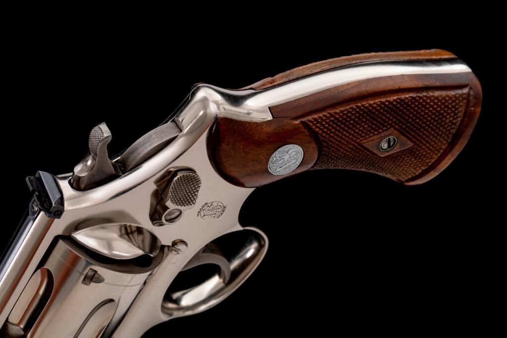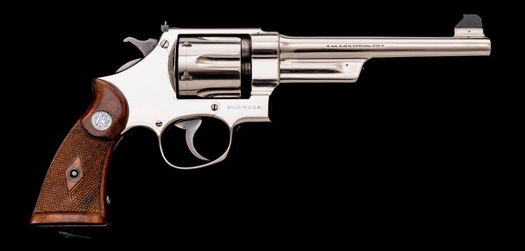Smith & Wesson .44 Hand Ejector Second Model Double Action Revolver, now in target configuration, #19739, .44 S&W Spec. cal., 6.5" pinned barrel, nickel finish, checkered walnut diamond center Magna grips. Target sights include a pinned blade front and adjustable notched rear. Hammer and trigger are color case hardened. Frame and yoke with matching assembly numbers (8535). The numbers on the barrel and cylinder (562813) match each other but do not match the serial number on the frame. Serial number on the frame is located on the left side under the grip and at the butt, which now has a lanyard ring. There is also a factory rework star and "156" located on the left side of the frame, under the grip. Included is a factory letter that states this revolver was originally shipped to Harper Reynolds, Los Angeles, CA., Sept. 16, 1924; with factory letter signed by S&W Historian Roy G. Jinks. The letter also lists the shipping information for serial #S62813 but does not list any of the revolvers features. It does also mention that there is no factory information that this gun was converted by S&W and was likely done by a gunsmith. An interesting revolver due to the above information and star on the left side of the grip frame. Condition is about fine, retaining approx. 95% nickel finish, which appears original. Nickel has light scratches and other typical handling marks. There are a few pin prick blemishes, mainly around the barrel pin. Factory lettering is clear. Approx. 50% muted case colors remain. Grips show typical signs of age and moderate handling wear, checkering is primarily crisp. Action cycles smoothly and cylinder locks up securely. Bore is very good, showing normal wear, lands and grooves are clearly defined. Est.: $1,500-$2,000. (C&R/PPT)