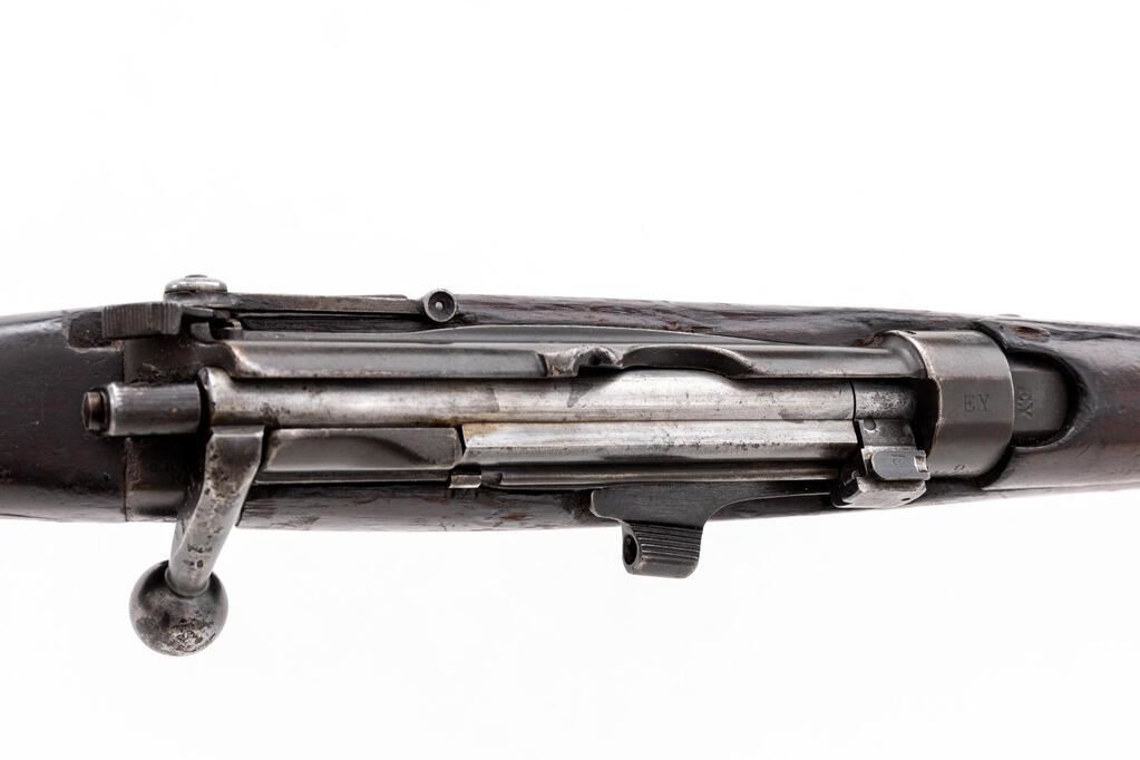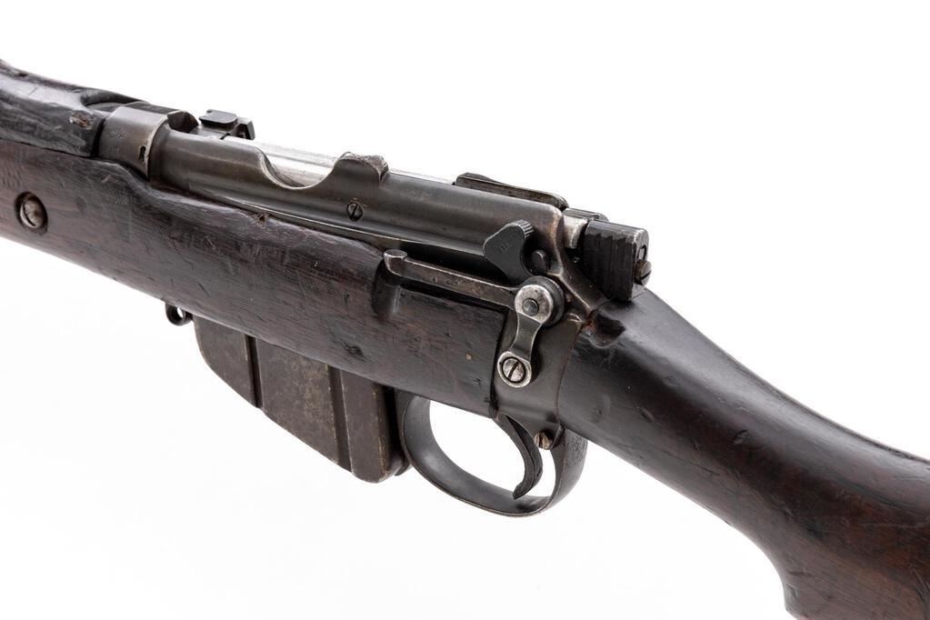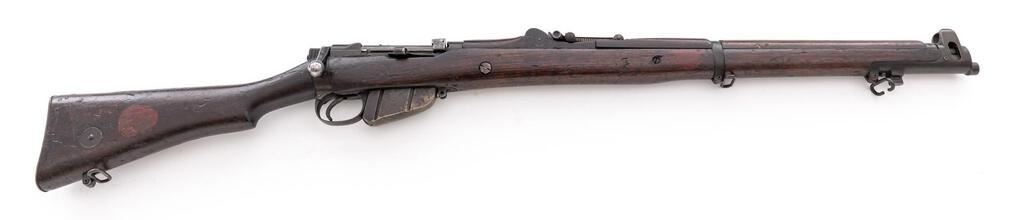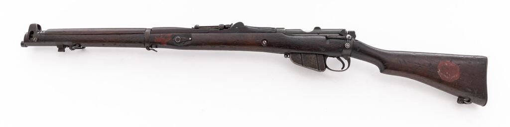 British No. 1 MK 1*** Lee-Enfield Bolt Action Rifle, #Q15509, .303 Brit. cal., 25.2" barrel, blued finish, hardwood stock set, blade front sight with protectors and rear sight adjustable for windage and elevation. Right-side action body marked "(crown)/E.R/B.S.A. Co/SPARKBROOK/1907/sht.le/1.***". Marked "EY" on top of receiver, barrel shank, and right-side buttstock. Mismatched numbers on bolt handle, other numbers matching. Faint number on forend. Rifle has early features to include action body without charger bridge, bolt head with dovetail, magazine cutoff, windage adjustable rear sight with bone inserts, protectors mounted to rear hand guard, and long-range volley sight aperture and pointer. Condition overall is good with the metal retaining approx. 75% finish, with old patina to the magazine. Front hand guard appears to be a later replacement. There are red paint spots on the buttstock and forend. Condition of the wood is good with overall bruises and handling marks to the dark finish. Action operates smoothly, dark bore is fair to good rifling. No visible import marks. Est.: $600-$800. (C&R)