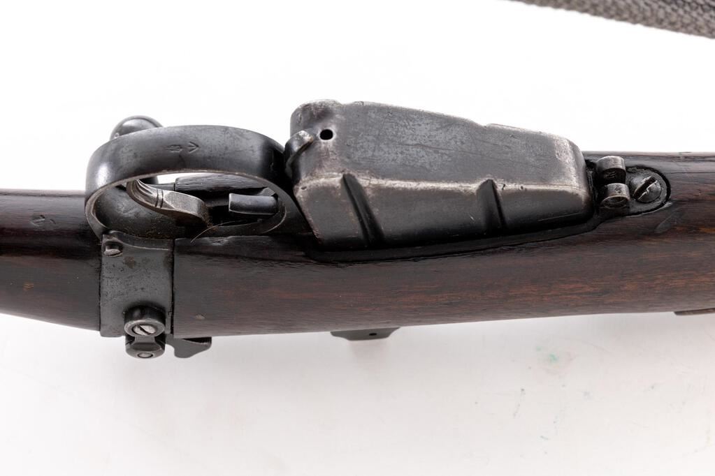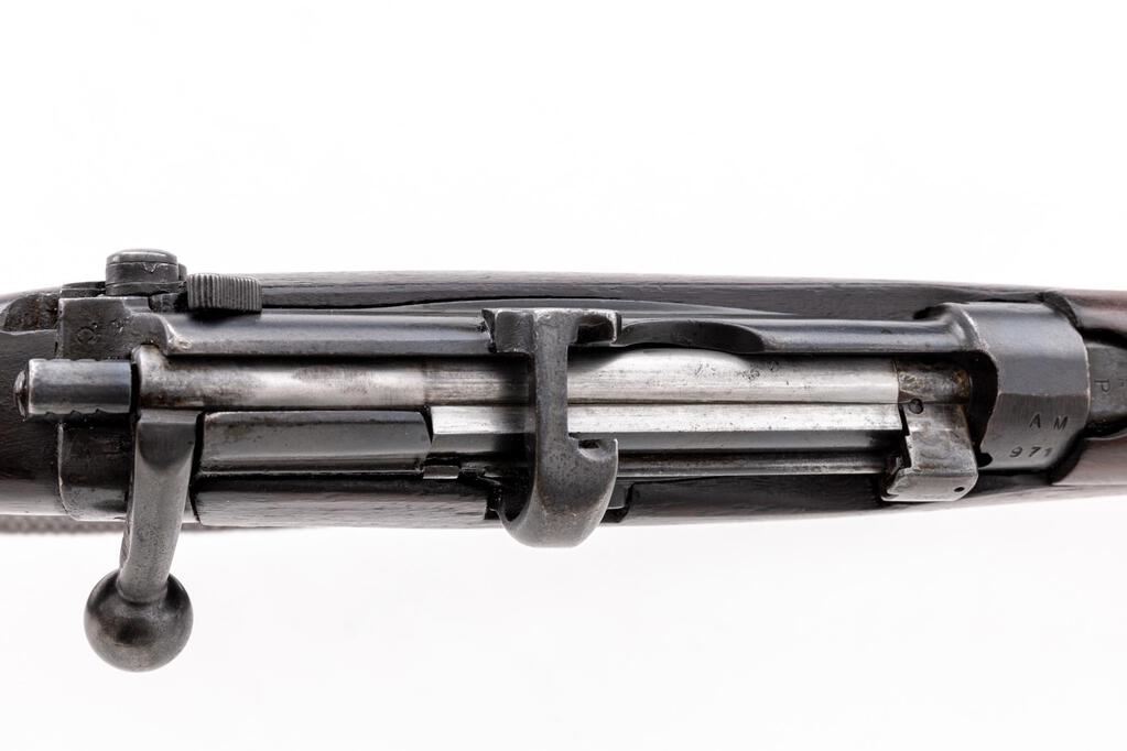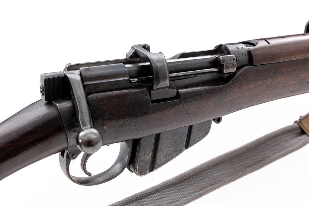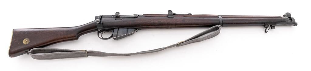 British Air Ministry Marked No. 2 MK IV Lee-Enfield Bolt Action Rifle, #971, .22 LR cal., 25.2" barrel, blued finish, walnut stock set, blade front sight with protectors and adjustable tangent rear sight. An excellent condition British Air Ministry marked blue cotton sling is attached. Rifle was arsenal converted and is marked on the right-side action body with the original "(crown)/GR/ENFIELD/1918/SHTLE/III*". Right-side receiver ring marked "AM/971" indicating conversion to an Air Ministry training rifle by fitting a .22 cal. Barrel, a magazine with no follower, and installing a special bolt head marked ".22 No. 2C". Rear of bolt handle and nose cap stamped with matching numbers. Rear sight leaf marked with different numbers. Condition overall is very good with the metal retaining approx. 85% finish, the magazine showing edgewear, scratches, and patina. Two wood inserts are missing from the top of the rear hand guard. Wood is very good showing impressions and handling marks to the dark-applied finish. There are a few small dark spots below the muzzle, otherwise the bore is bright with very good rifling. Action operates smoothly. Import stamped on right side of receiver. Est.: $700-$900. (C&R)