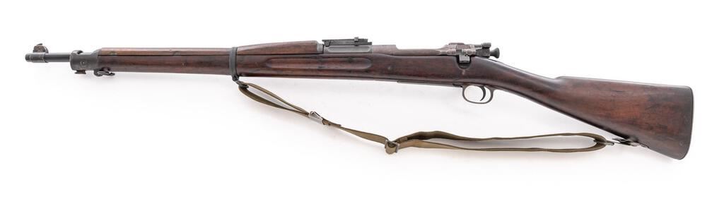 U.S. Springfield Armory Model 1903 Bolt Action Rifle, #1464224, .30-06 cal., 24" barrel dated SA 5-32. Rifle was arsenal refinished and the receiver is dull with a purplish tone. Rear sight and upper band are Remington Arms and the band has light pitting. The overall military finish is good with wear. The finger grooved stock is good, has been sanded, and a "(circle)P" proof is visible behind the trigger guard but no visible cartouche. Bore with good rifling but light erosion. There is an "L 7" and a symbol stamped in front of the magazine. Included are an OD WWII M1 sling and a plastic oiler stored in the buttstock. Est.: $800-$1,200. (C&R)