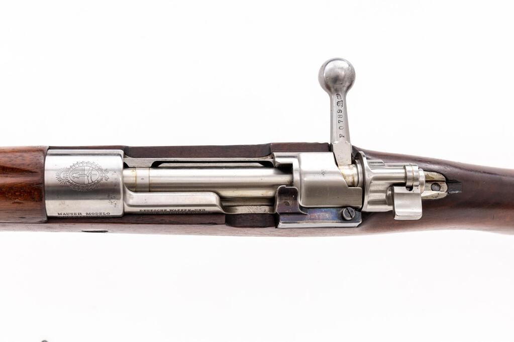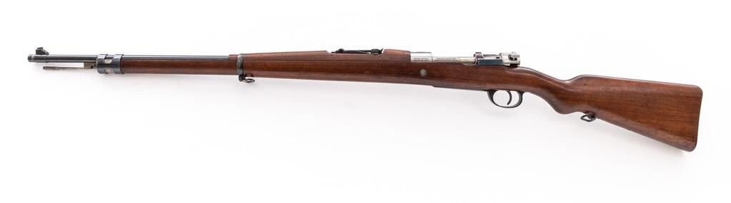 Argentine DWM Mauser Model 1909 Bolt Action Rifle, #F0789, 7.65mm x 53mm, 29.1" barrel, blued and in-the-white finish, Argentine crest on chamber, DWM markings on left side of receiver, all visible numbers matching, drift adjustable inverted "V" front sight and tangent rear sight adjustable from 3 to 20 yards. Bayonet lug, matching serial number cleaning rod, "H" type front barrel band, narrow rear band, nice walnut stock and upper hand guard, bottom sling swivels, machined trigger guard and floorplate with release lever inside trigger guard, and steel buttplate. Condition is excellent showing some scratches and wear to the front of the barrel and muzzle area, thinning to the top of the barrel between the bands, scratches and wear to the barrel bands, age graying and dried grease on the bayonet lug, scratches and light wear to the fire blued rear sight slider and bolt release lever, thinning and scratches on the trigger guard and floorplate. Receiver shows a couple of spots where minor rust was removed and some pitting remains. Action and safety work properly; bore is mostly bright with light frosting that may improve with cleaning. Stock shows numerous dings, scratches, small depressions, and scuffs, with clear stamped markings. Buttplate shows minor pitting at the top and bottom that has been cleaned. Est.: $800-$1,200. (C&R)
