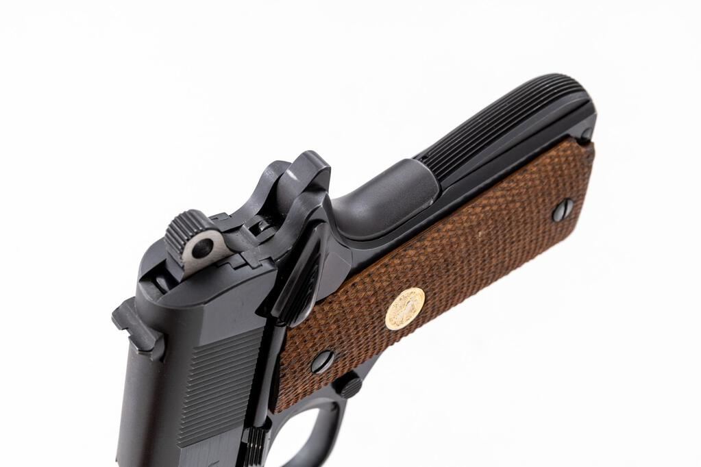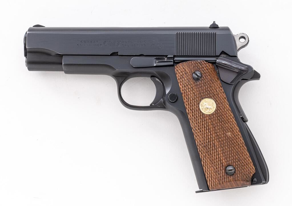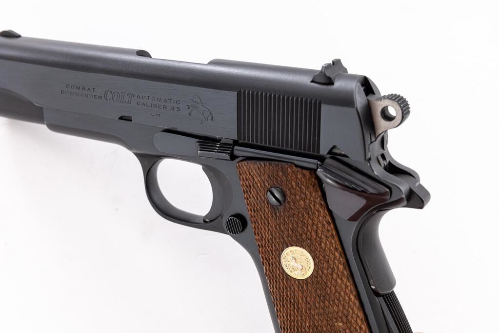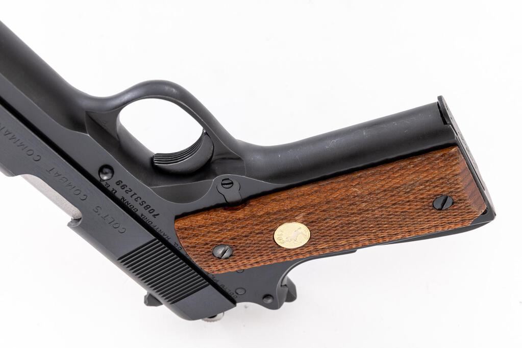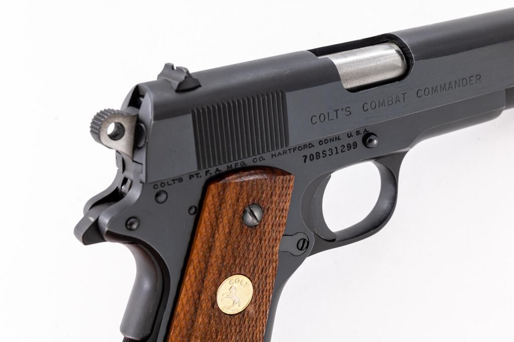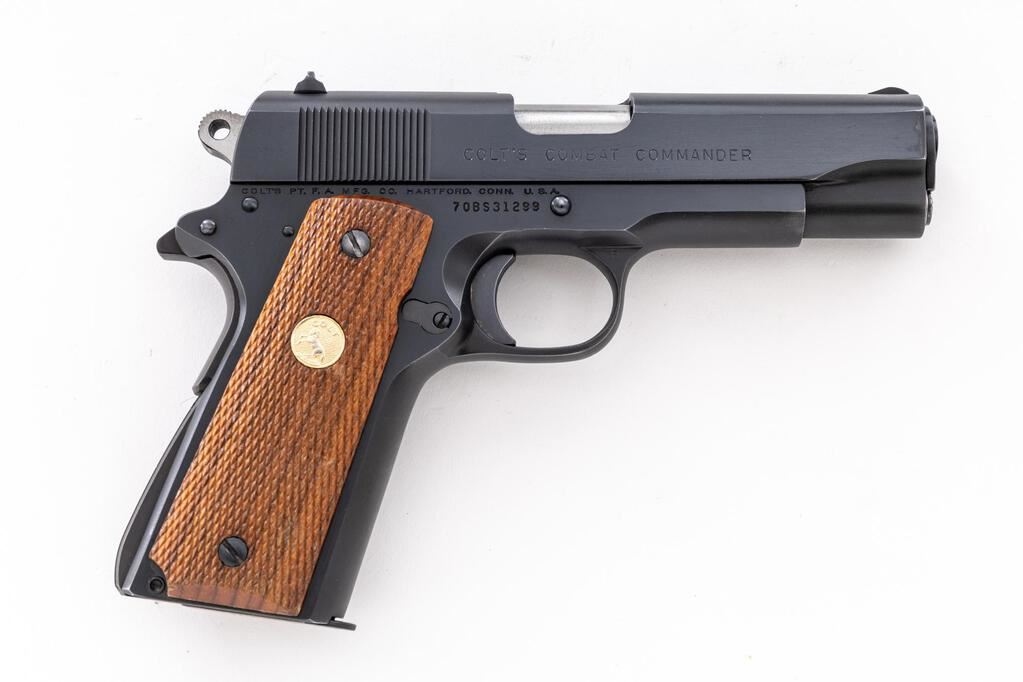 Colt Series 70 Combat Commander Semi-Automatic Pistol, #70BS31299, .45 ACP cal., 4-1/4" barrel, blue finish, checkered walnut grips with gold Colt medallions, standard blade front and square-notched rear sights. Includes one blued steel Colt magazine. Mfg'd 1975. Condition is near excellent showing typical signs of light use, with intermittent slight scratches and small handling marks, retaining approx. 97% factory blue. There is a faint arched scratch to the left side of the frame, near the slide stop; light scuffs and handling marks to the front strap. Factory lettering is clear. Grips with a few small flat spots to the checkering, which is otherwise crisp, medallions are bright. Action operates smoothly. Bright and shiny bore has well-defined rifling. Est.: $1,200-$1,500. (Modern/PPT)
