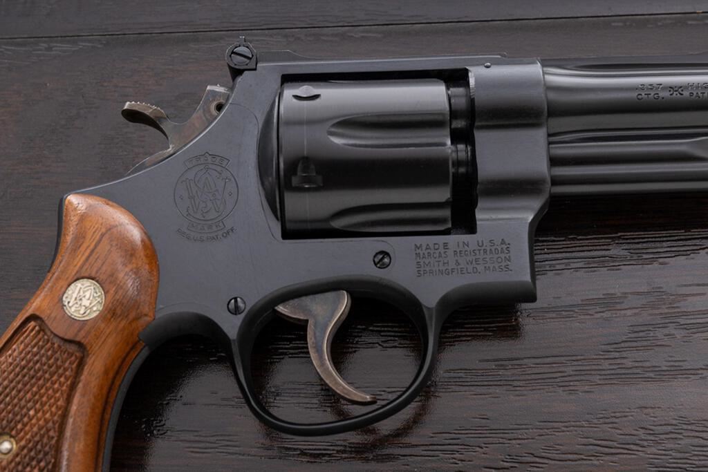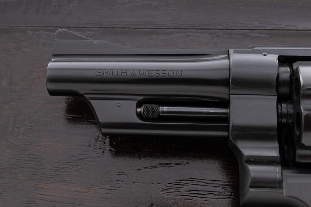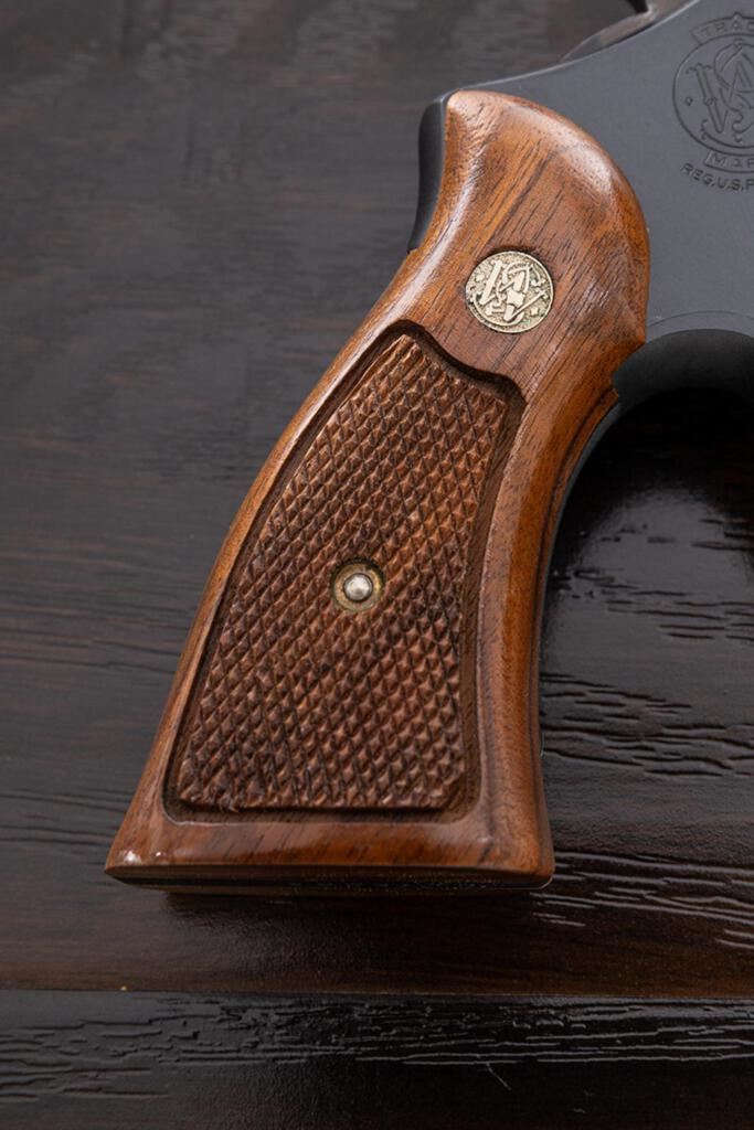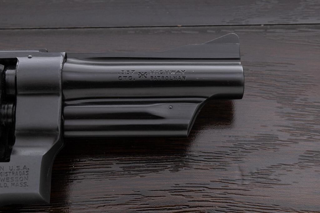 Smith & Wesson Model 28-2 Highway Patrolman Double Action Revolver, #N175302, .357 Magnum cal., 4" pinned barrel, matching numbered checkered walnut magna grips, ramped blade front sight, square-notched rear sight that is adjustable for windage and elevation, color case hardened serrated trigger, and semi-target hammer. Mfg'd ca. 1973. Condition is excellent retaining approx. 98% factory blue, with slight wear at the muzzle. Factory lettering is crisp. Case colors are vibrant. Grips with a few tiny indentations and little finish wear to the lower edge of the left grip, checkering is sharp. Action cycles smoothly and locks up securely. Chambers and cylinder face are clean, appearing little used. Bright bore with well-defined rifling. Est.: $700-$900. (Modern/PPT)
