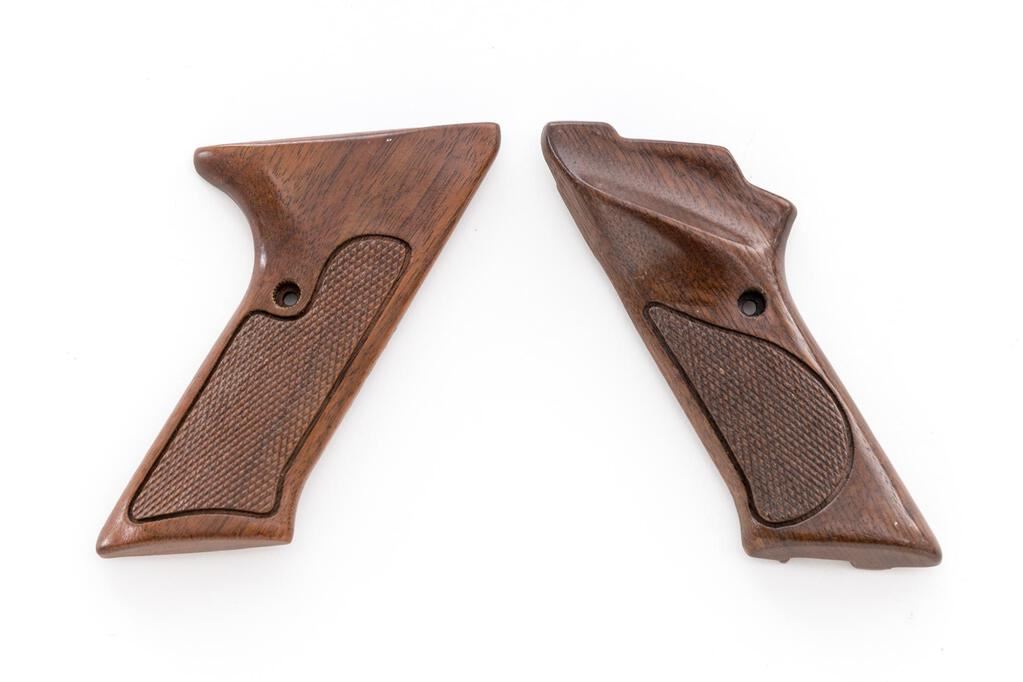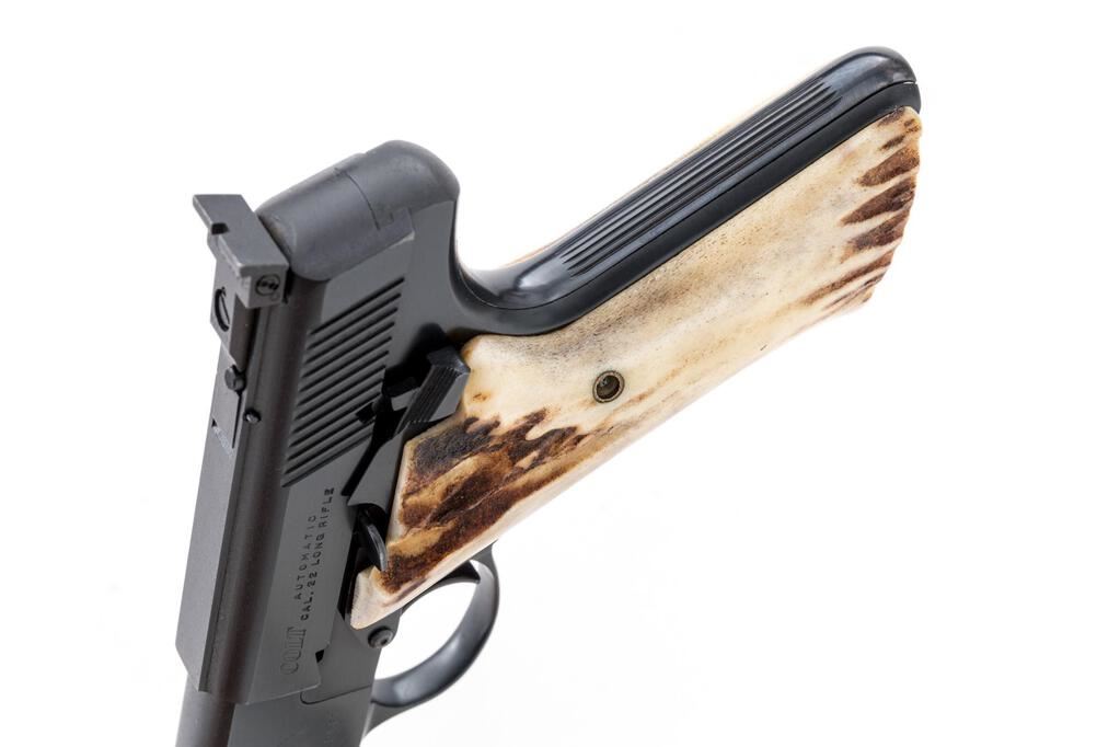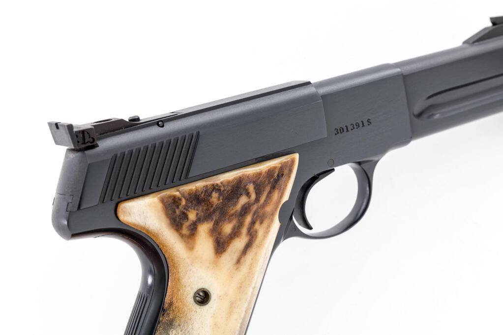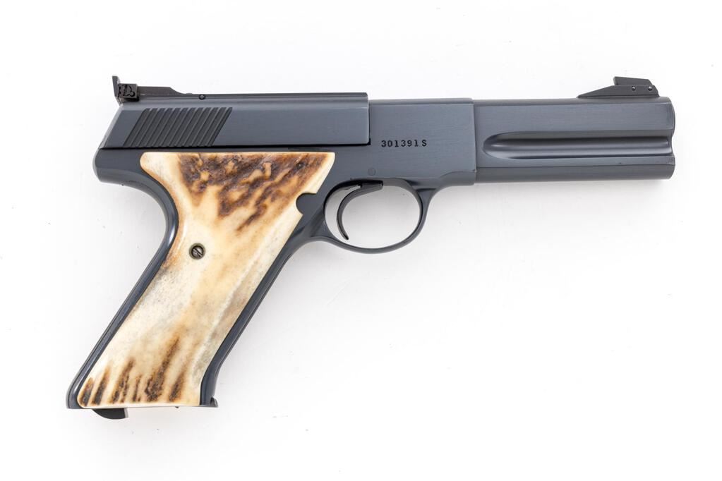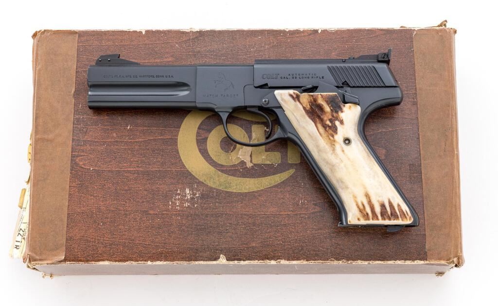 Mint Colt Woodsman 3rd Series Match Target Semi-Automatic Pistol, #301391S, .22 LR cal., 4.5" barrel, blue finish, with a pair of stag grips and the original checkered walnut grips. Sights include a Patridge front and square-notched Elliason rear sight that is adjustable for windage and elevation. Includes one original 10-rd. Colt magazine. In the original Colt box with matching numbered end label, two-piece Styrofoam insert, and safe handling instructions. Box end label was originally marked as having a 6" barrel and was later crossed out. Condition is excellent, appearing as new, and likely unfired. Approx. 99%+ factory metal finish remains. Stag grips are also like new and fit well. The original walnut grips are excellent with only a few very minor handling marks, checkering is sharp. Smooth action, mirror bright bore. Box shows age and wear, some of the small interior flaps are missing, and the remaining end panels have been reinforced with brown tape. End label is legible, but the bottom portion is tattered and peeling free from the box. Est.: $1,200-$1,800. (Modern/PPT)