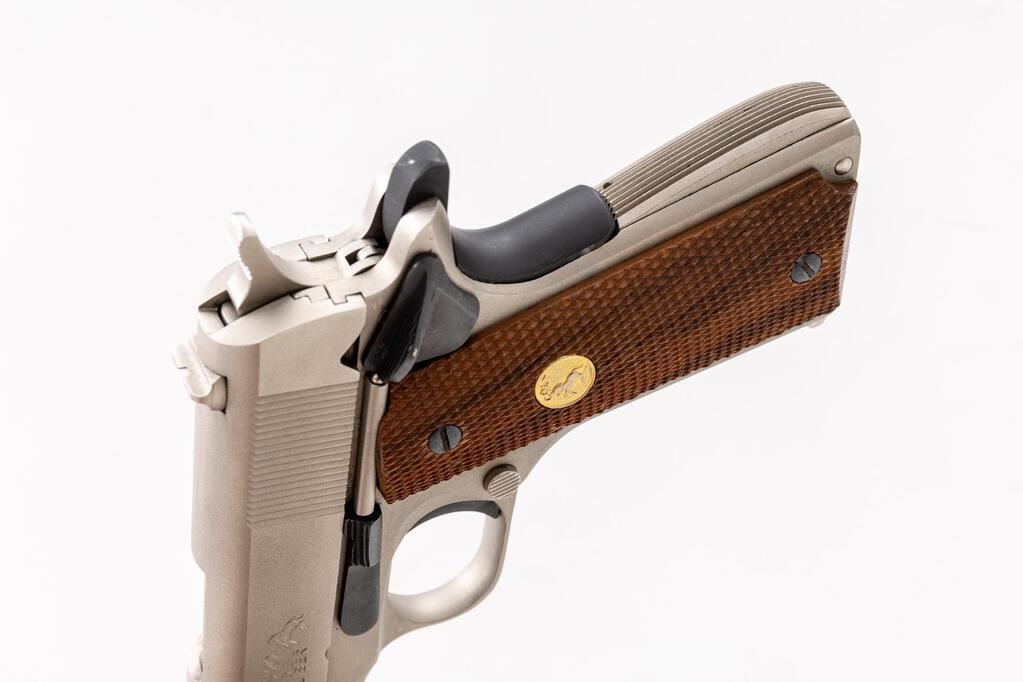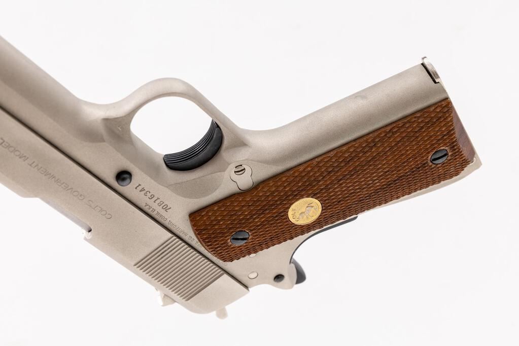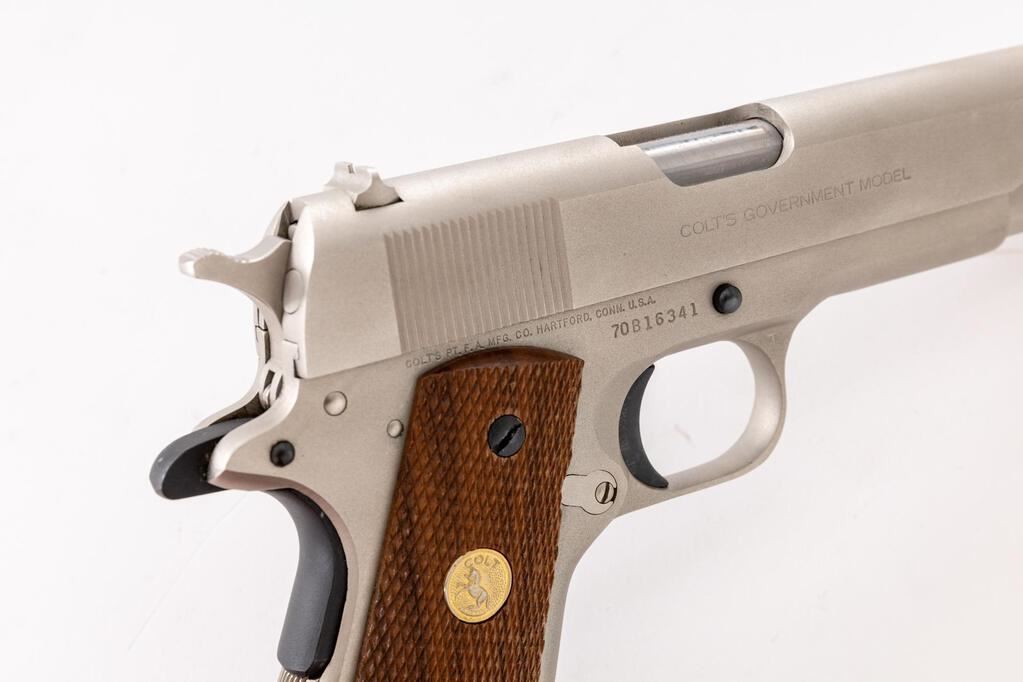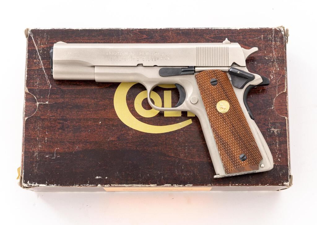 Colt MK IV Series 70 Government Model Semi-Automatic Pistol, #70B16341, .45 ACP cal., 5" blued barrel, satin nickel finish, blued small parts, checkered walnut grips with gold Colt medallions, standard blade front and square-notched rear sight. Includes one nickel-finished Colt magazine. In original wood grain pattern Colt box with matching numbered end label, two-piece Styrofoam insert, instruction manual, and misc. factory paperwork. Mfg'd 1982. Condition is excellent, with the satin nickel finish showing only a few light scuffs and minor handling marks, the most noticeable on the front grip strap. Approx. 95% blue remains with a little normal operational wear to the sides of the grip safety and trigger. There is a small flat spot to the checkering on the front edge of the left grip, small scratch to bottom edge of the right grip, otherwise checkering detail is sharp. Action operates smoothly. There is moderate powder fouling present in the chamber. Bore is very good, bright with well-defined rifling. Box shows moderate storage type wear, mainly along the edges. Est.: $1,500-$2,000. (Modern/PPT)