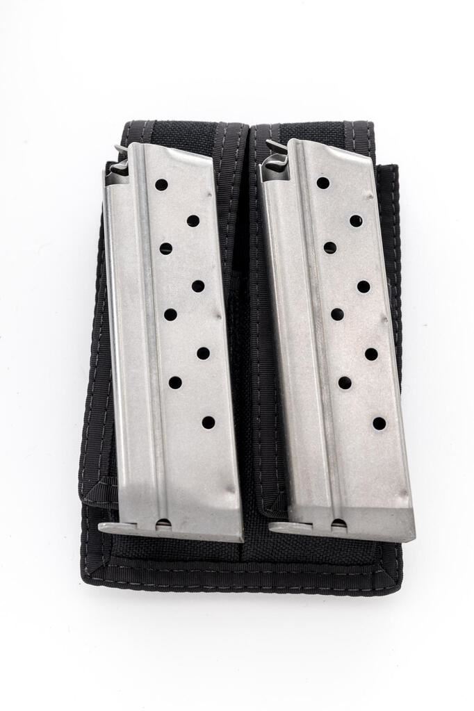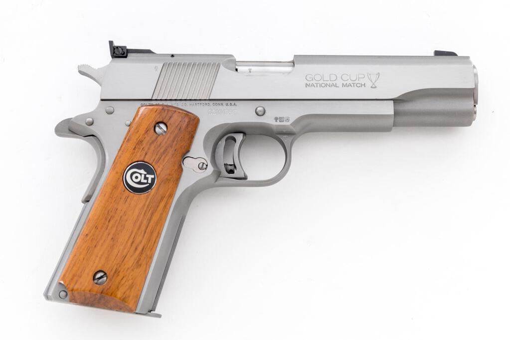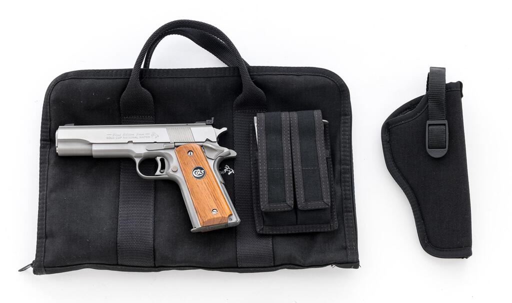 First Edition Colt Gold Cup Semi-Automatic Pistol, with German Proof Marks, #GCNM097, 9mm, 5" barrel, stainless finish, smooth wood grips with Colt medallions, blade front sight, square-notched Elliason rear sight that is adjustable for windage and elevation, skeletonized trigger, with three (3) stainless Colt magazines. Only 500 First Edition pistols were produced, having standard Colt markings; additionally, the left side of the slide is marked "First Edition". This pistol also features commercial German proof marks on the right side of the barrel, frame, and slide. Mfg'd 1989. Includes the original First Edition Colt soft carrying case. Condition is excellent, appearing like new. Frame and slide with only a few insignificant handling marks. Factory lettering is crisp. Grips and action are like new. Bore is bright with strong rifling. Est.: $1,500-$2,000. (Modern/PPT)