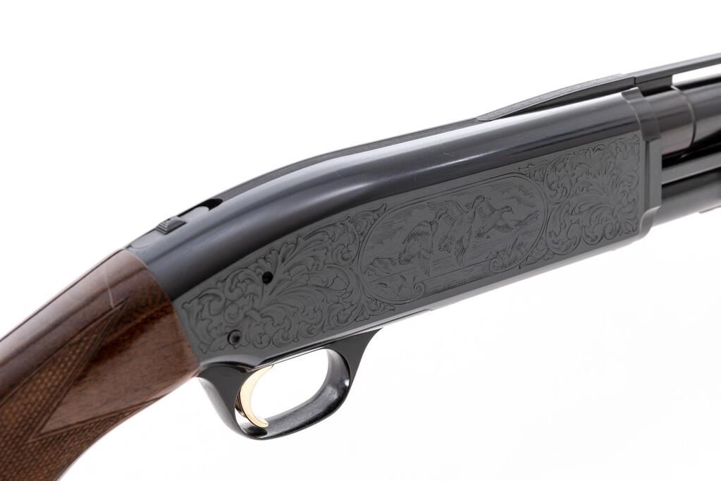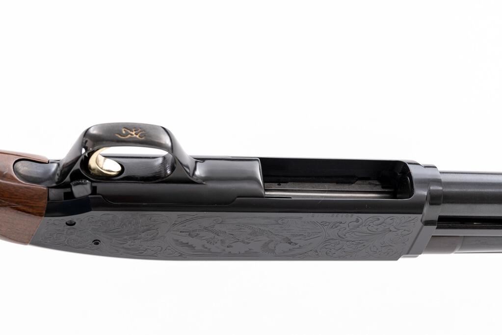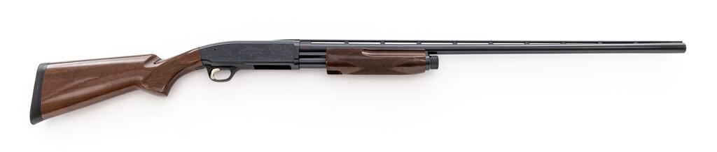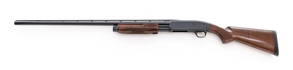 Browning BPS Hunter/Field Model Slide-Action Shotgun, #20132NZ152. 12 ga. 32" vent rib barrel has target beads, 3" chamber, and is fitted for standard Invector choke tubes (Mod. Installed). The bottom loading and ejection action is based upon the Browning 1917 patents and is housed in a steel receiver with new engraving pattern in 1991. The finger-groove forend and pistol grip buttstock are of high-gloss finished straight-grain walnut, with extensive checkering and original Browning black recoil pad. Stock dimensions are 14-1/4"x1-5/8"x2-3/8". Made by Miroku in Japan for Browning in 1991. Condition is near excellent, with a few handling marks to buttstock but nominal wear to action, which locks tight and operates correctly; bore is bright. Receiver engraving is sharp, with some metal turning plum. Est.: $500-$700. (Modern)