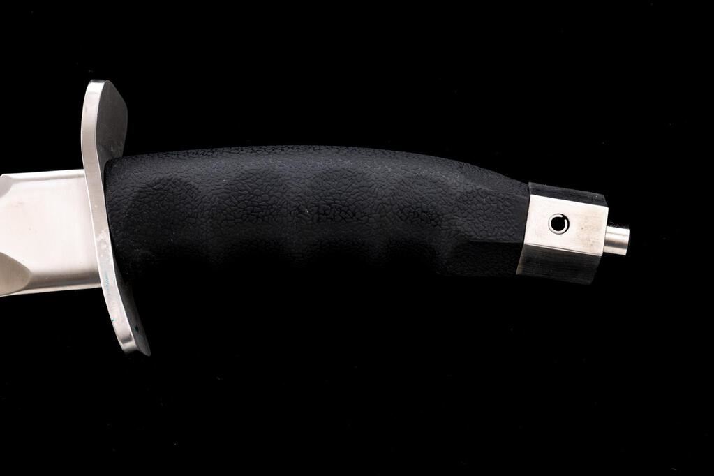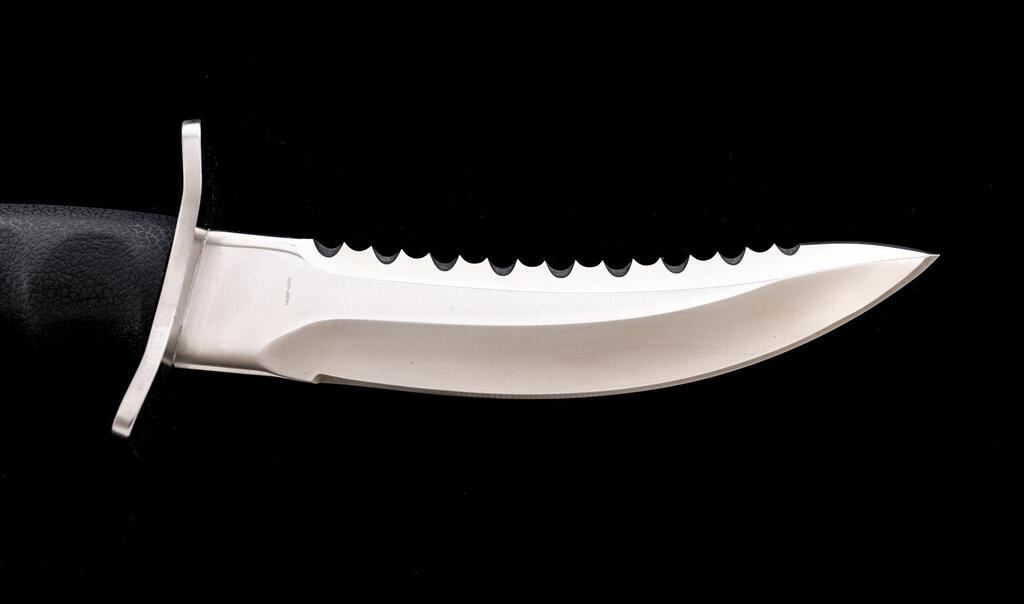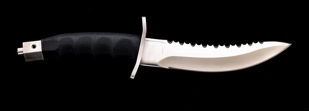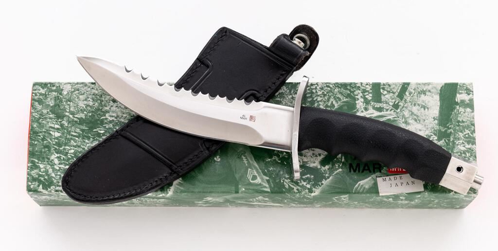 Al Mar Model 3103 Warrior Fixed Blade Knife, Seki-Japan, 7-1/8" blade with serrated top edge, 13-3/8" overall, finger grooved rubber handle with hidden tang, stainless full guard and stainless butt. One side of blade has Al Mar logo, and the other side is marked Seki-Japan. Includes black leather sheath, box, and small "Warriors Edge" warranty card. Knife is in excellent unused condition. There are a few minor handling marks on the blade. Guard and butt show a small amount of light scuffs and scratches. Sheath is near excellent with intermittent small and shallow impressions, no major blemishes. Box shows a little creasing but overall is in very nice shape. Est.: $600-$800.