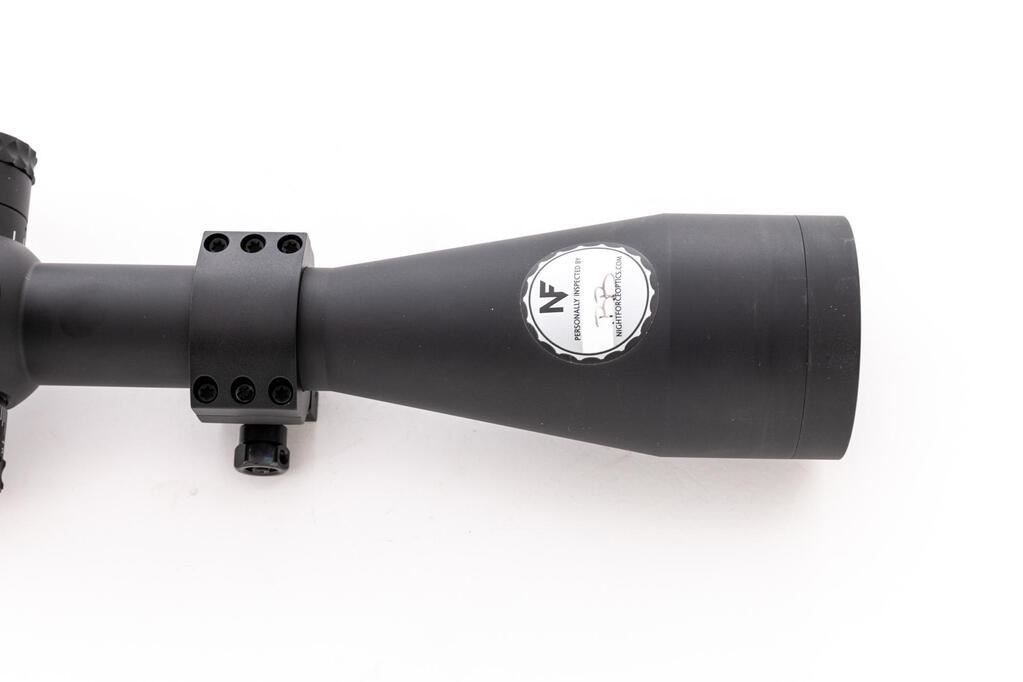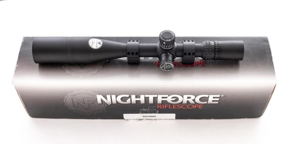 Nightforce NXS Rifle Scope, 5.5-22X50 Zero Stop MOAR C433, 30mm tube, .250 MOA, matte black finish, MOAR SFP reticle and Zero Stop elevation turret. Scope is in excellent condition with only light handing marks, reticle is clear. Includes factory box, instruction manual, sunshade, rubber scope cover, adjustment tool, and non-Nightforce scope rings, which have been installed on the scope. Est.: $1,100-$1,400.