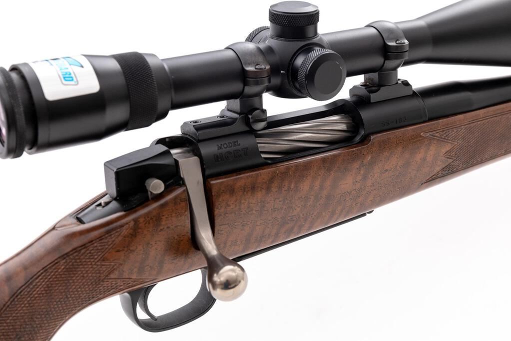McMillan Bros. MCRT Bolt Action Rifle, with Bushnell Scope, #SS-183, 6.17 Spitfire cal., 24" Sporter barrel is unmarked except for caliber, metal with a dark blue finish. Pistol grip wood grain pattern fiberglass stock with point checkering, slight right-hand palm swell, Monte Carlo comb, cheekpiece, solid black rubber Decelerator recoil pad, and sling swivel studs. Barrel was mfg'd without sights. Topped with a Bushnell Legend Ultra-HD 4.5-14x44mm scope. Scope has a matte black finish, Mil-Dot reticle, and sunshade. Metal surfaces rate in excellent overall condition retaining approx. 97% finish, with light scratches and edgewear to the trigger guard and floorplate. Stock is very good with scattered light scratches, handling marks, cheekpiece edgewear. Action is crisp and operates smoothly, bore is mirror bright with strong rifling. There are light scuffs and minor blemishes visible on the outside of the scope, optics are bright and clear. Includes an RCBS 6.17 Spitfire full-length resizing die and seating die, and an additional Bonanza 7mm Remington full-length sizing die. Est.: $1,800-$2,400. (Modern)