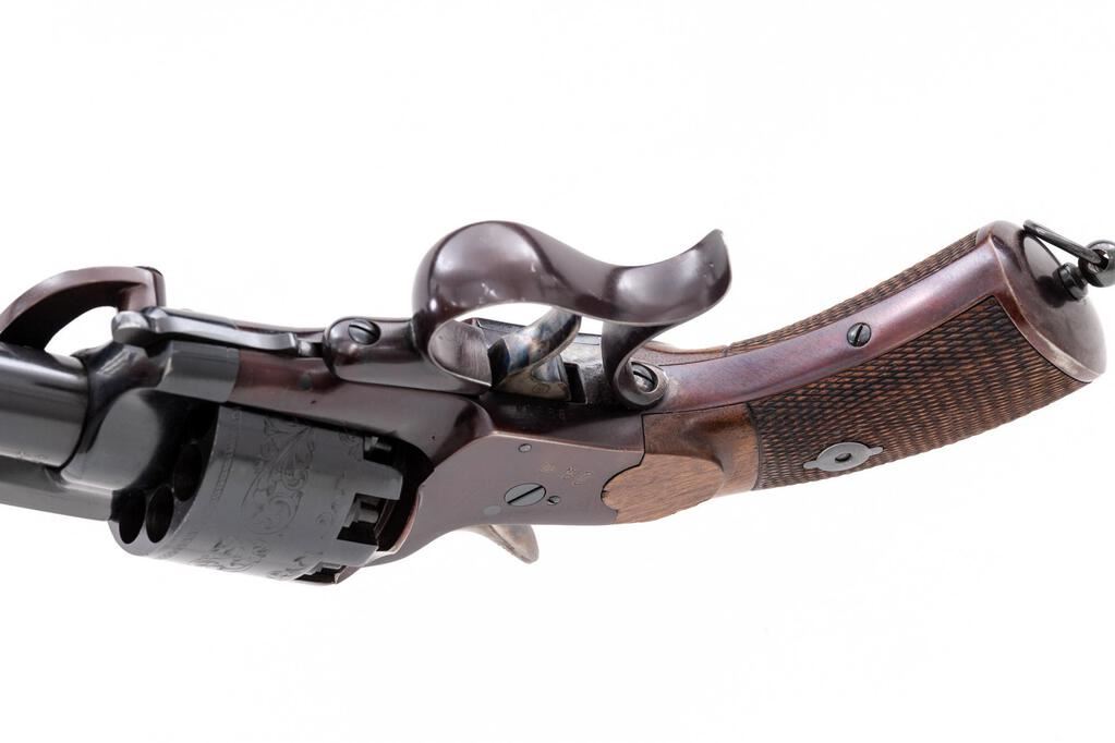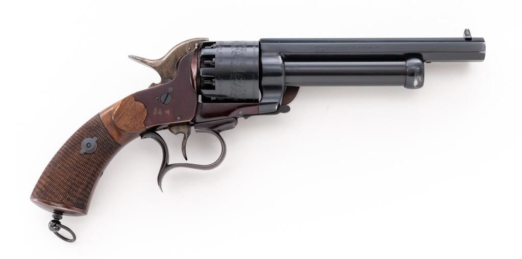 Reproduction Civil War LeMat "Grapeshot" Two-Barrel Percussion Revolver, by Pietta, with Box, NVSN, .44 cal./.66 cal. over/under barrels, the 6.75 octagonal top barrel is engraved "Col. LeMat" amid scrolled flourishes on top, maker's name, address, and proofs at right, B.P. warning and caliber at left, has complex articulated loading lever at left side; the 5" round under-barrel is unmarked. Round scroll-engraved cylinder fires 9 shots from outside ring, single buckshot centrally. Large open-top frame has central hammer with firing selector at nose and long thumb-lever, scrolled trigger guard with finger-spur, integral straps with lanyard ring at oval butt, 2-pc. checkered walnut grips. Condition is new and unfired, the barrels and cylinder retaining all of its original deep black-blue, the frame/straps showing a lovely plum coloration (minutest wear around lanyard ring), pleasing case colors to hammer and trigger. Grips are mint with sharp checkering. Action is strong and crisp, bores show full blue and sharp rifling in the octagonal barrel. Plain cardboard box has die-cuts for revolver, is very good. Est.: $900-$1,200. (No FFL Required)
