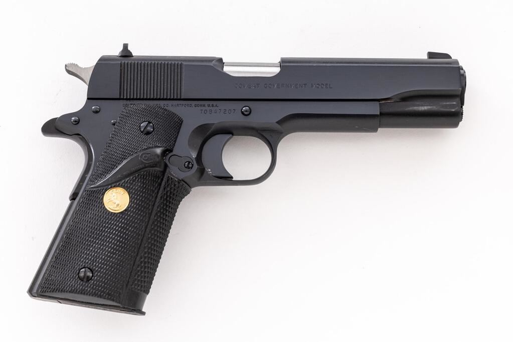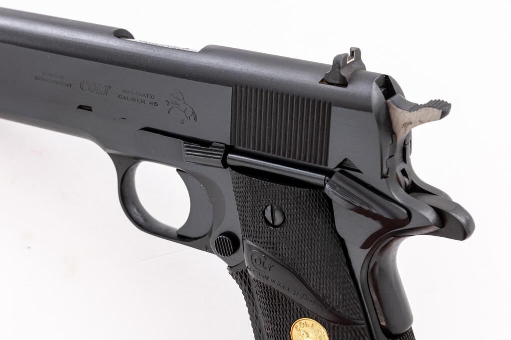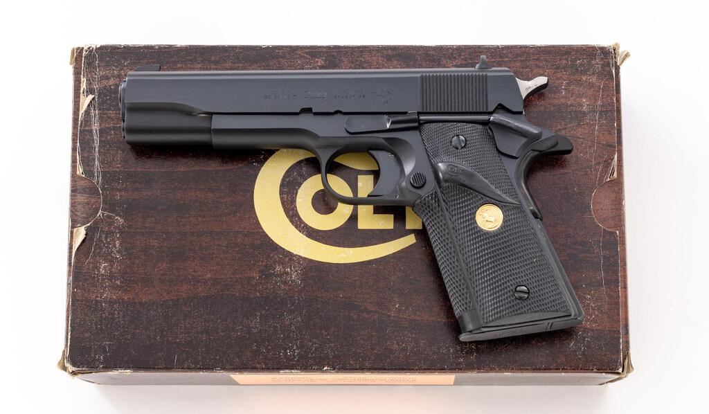 Colt Series 70 Combat Government Semi-Automatic Pistol, #70B47207, .45 ACP cal., 5" barrel, dark blue finish, checkered black rubber Colt/Pachmayr grips with gold Colt medallions, blade front sight and white outline square-notched rear sight, with one blued steel Colt magazine. Mfg'd 1982. In original wood grain pattern Colt box with matching hand numbered end label, two-piece Styrofoam insert, orange hang tag, instruction manual, and misc. factory paperwork. Condition is excellent, appearing near new, and retaining approx. 99% factory metal finish, with a few slight handling marks to the slide and left side of frame, below the slide stop. Grips are like new. Action operates smoothly. Bore is bright with clear rifling. Box shows moderate storage type wear, end label is clear. Est.: $1,400-$1,800. (Modern/PPT)