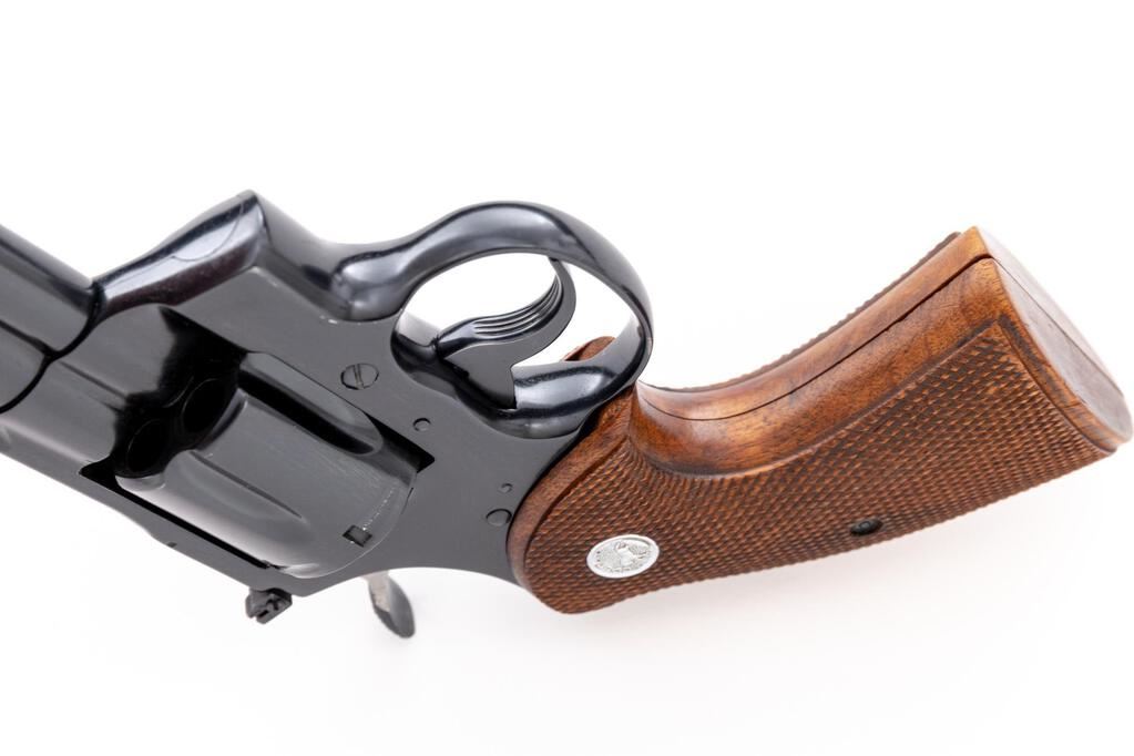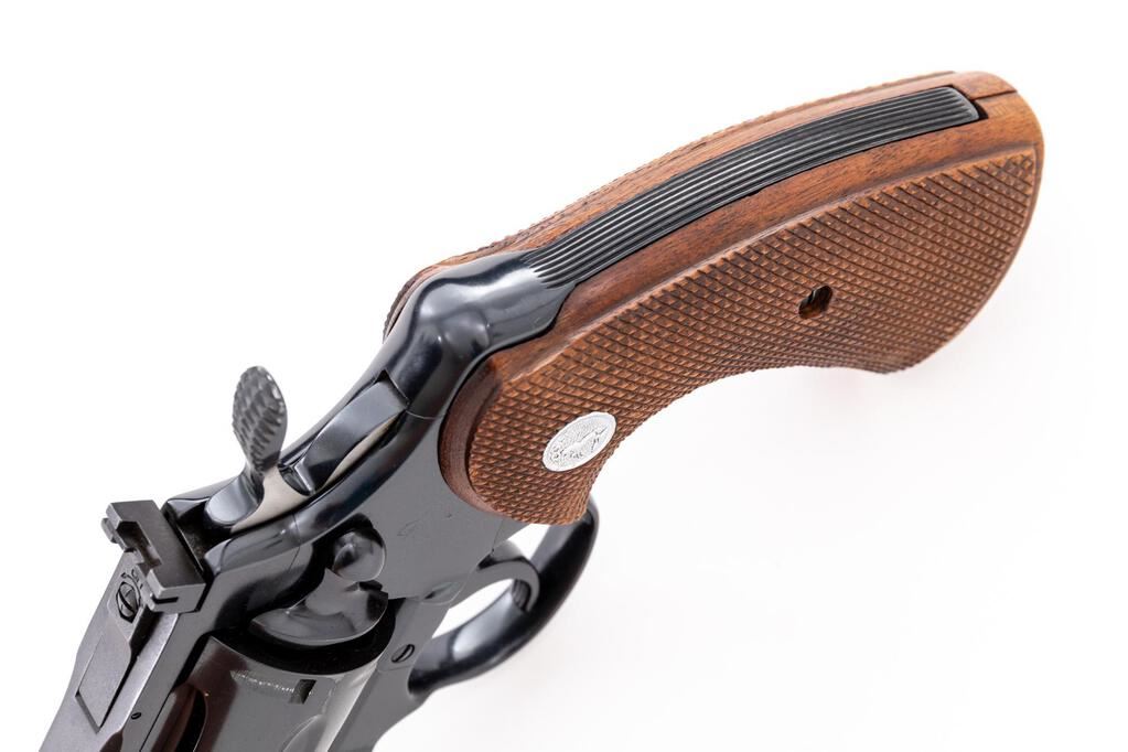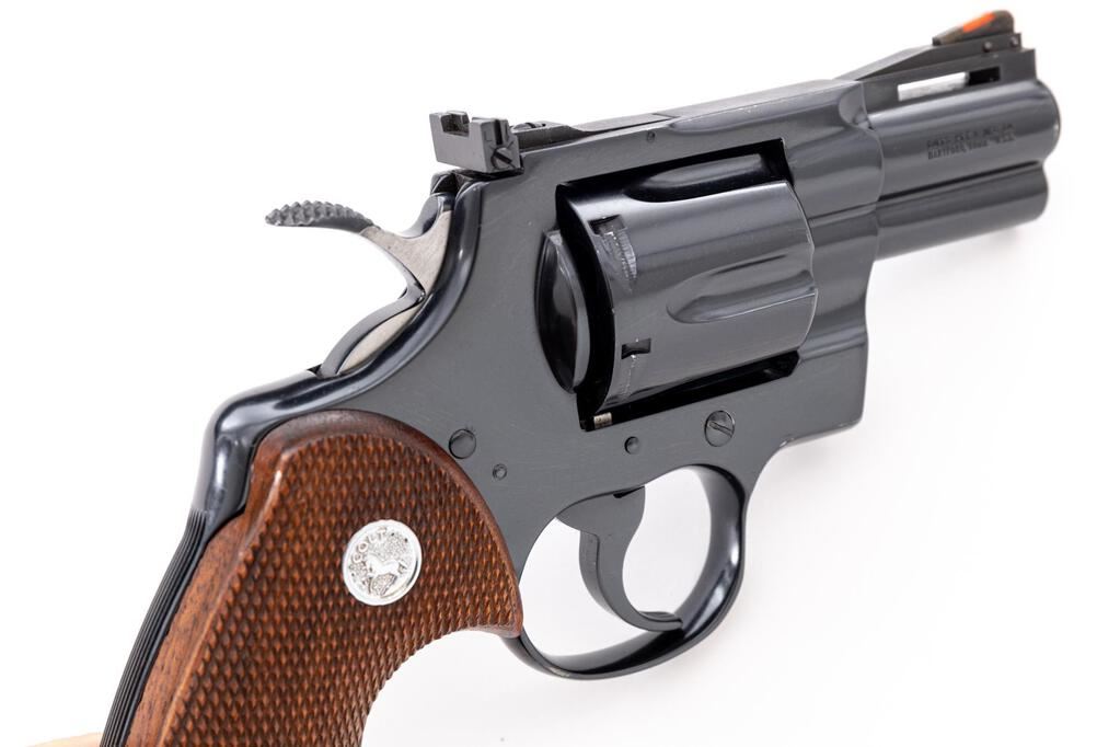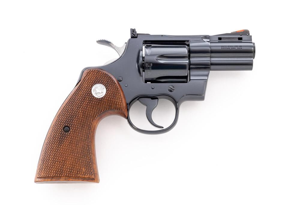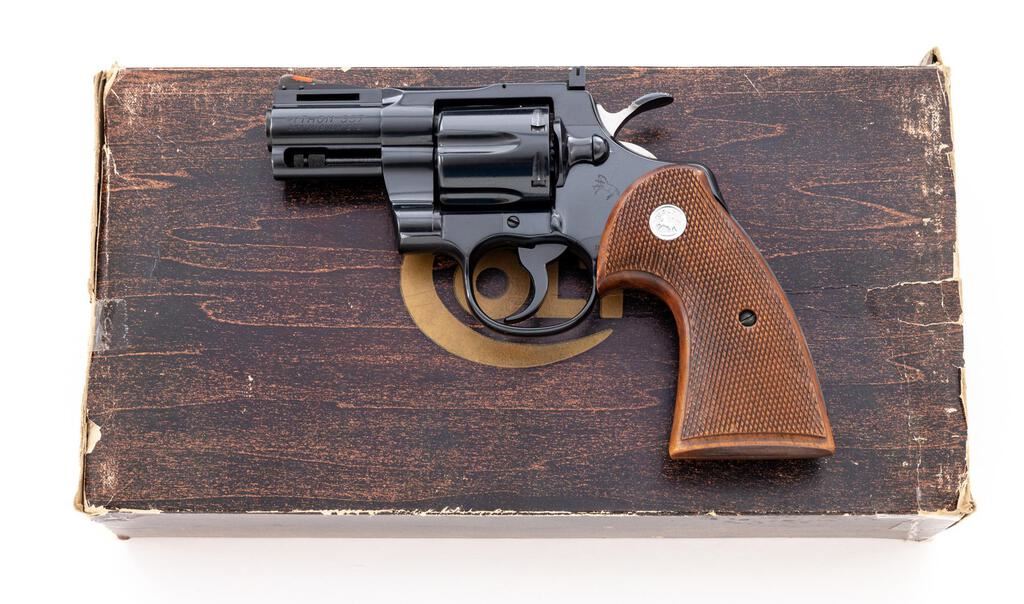 Colt Python Double Action Revolver, #30594E, .357 Magnum cal., 2.5" barrel, blue finish, first type checkered walnut target grips with silver Colt medallions, red ramp front sight, square-notched rear sight that is adjustable for windage and elevation. Mfg'd 1976. In an original wood grain pattern Colt Python box that has been renumbered to match this revolver. Includes the two-piece Styrofoam insert and instruction manual. Condition is excellent retaining approx. 98% factory blue, showing intermittent light handling marks and slight muzzle wear. Grip checkering has a few small flats spots and is otherwise crisp, edges show typical light handing wear, medallions are bright. Action cycles smoothly and locks up securely. Bore is bright with well-defined rifling; cylinder face and chambers are clean. Box shows storage type wear, with some tears and tatters along the edges. Est.: $3,000-$3,500. (Modern/PPT)