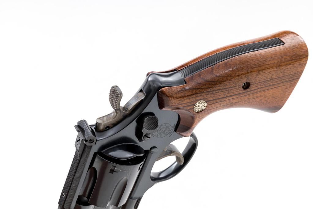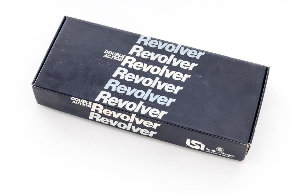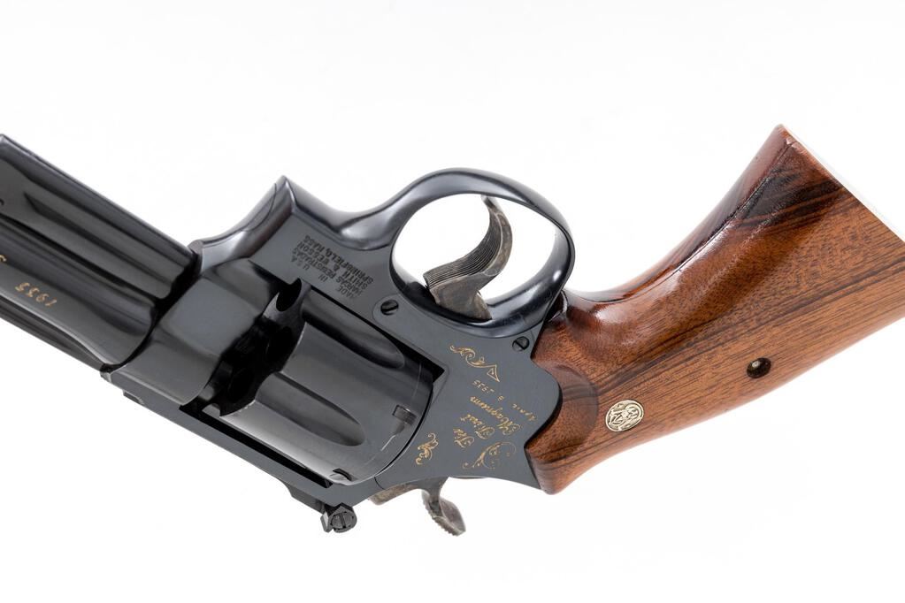 Smith & Wesson Model 27-3 Commemorative .357 Magnum 50th Anniversary Double Action Revolver, #REG0470, .357 Mag. cal., 5" barrel, blue finish, smooth Goncalo Alves target grips, ramped blade front sight and square-notched rear sight that is adjustable for windage and elevation, color case hardened target trigger and target hammer. Revolver features standard factory lettering, additionally the right side of the frame is marked in gold "The First Magnum April 8, 1935"; right side of the barrel "1935 50th Anniversary S&W .357 Magnum 1985". Includes the original matching numbered box with sealed cleaning kit and screwdriver, protective S&W paper, instruction manual, and misc. factory paperwork. In original wood presentation case with fitted blue interior, certificate, brass plaque inlaid into lid, and key. One of 2,500 mfg'd in 1985. Revolver is in excellent overall condition and retains approx. 98%+ factory metal finish. There is a thin turn line to the cylinder and a few minor scratches to the cylinder face. Factory lettering is crisp. Case colors are strong. Grips are like new. Excellent action and bore. There are intermittent scratches to the outside of the wood case, interior is excellent. Box is in very good condition showing only light storage type wear. The label has become detached from the end panel and is now affixed to the inside of the lid. Est.: $1,000-$1,500. (C&R List/PPT)