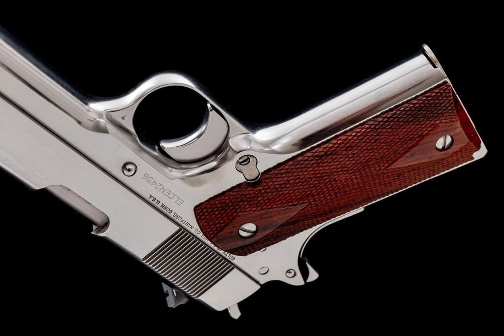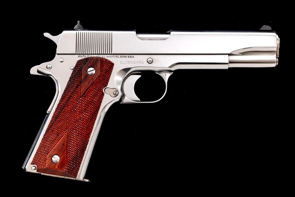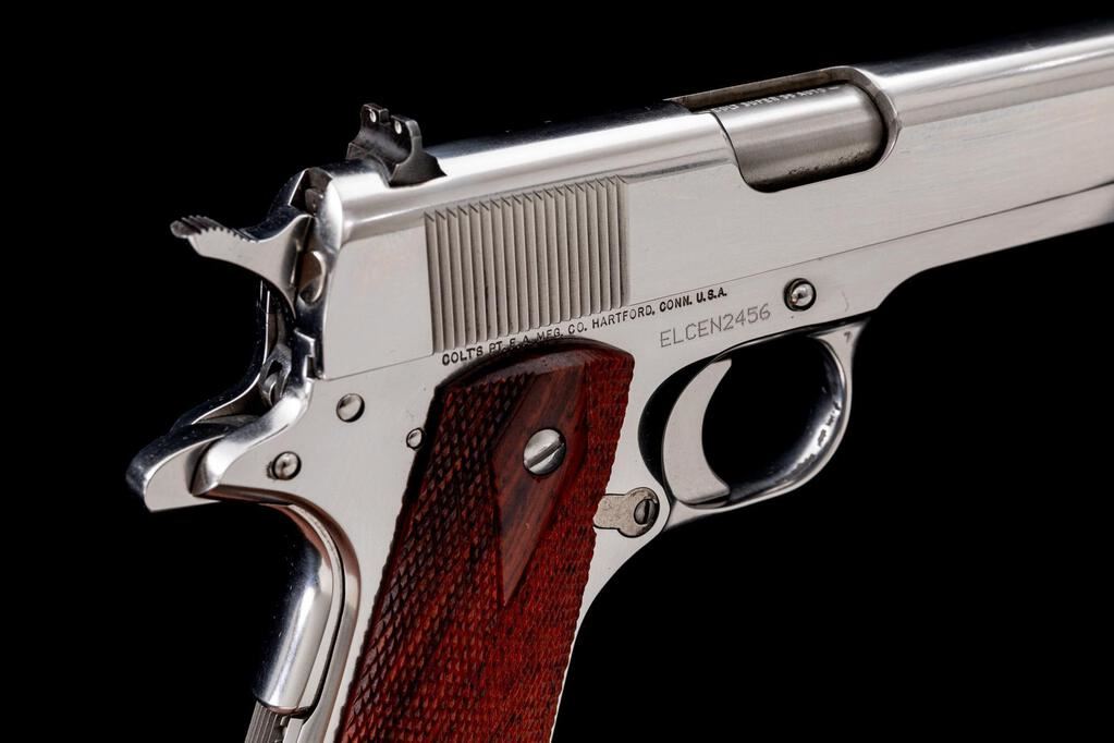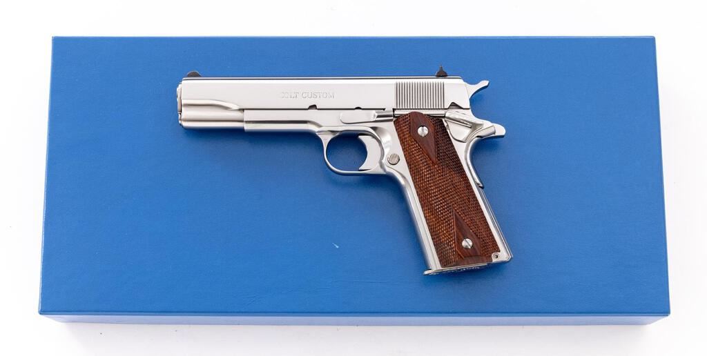 Colt Custom Shop Government Model .38 Super Semi-Automatic Pistol, #ELCEN2456, .38 Super cal., 5" barrel, bright stainless finish, checkered double diamond rosewood grips, white 3-dot sight configuration, with one bright stainless Colt magazine. Left side of slide is marked "COLT CUSTOM". In two-piece Custom Shop box, white exterior cardboard box with matching numbered end label, orange hang tag, cable lock, instruction manual, and misc. factory paperwork. Mfg'd 2001. Condition is excellent. Frame and slide with intermittent slight handling marks. Grips are like new with sharp checkering. Smooth action, bright bore with strong rifling. Internally very clean, appears unfired. Est.: $2,000-$2,500. (Modern/PPT)