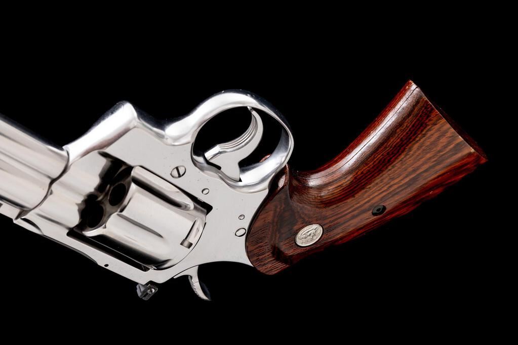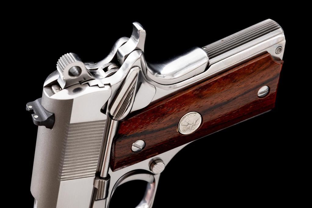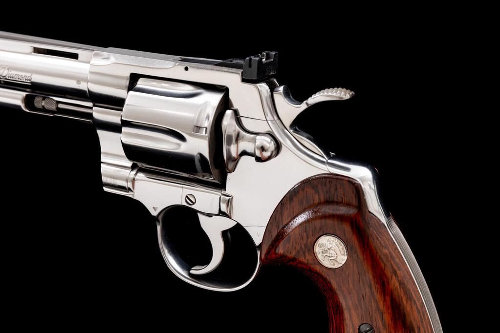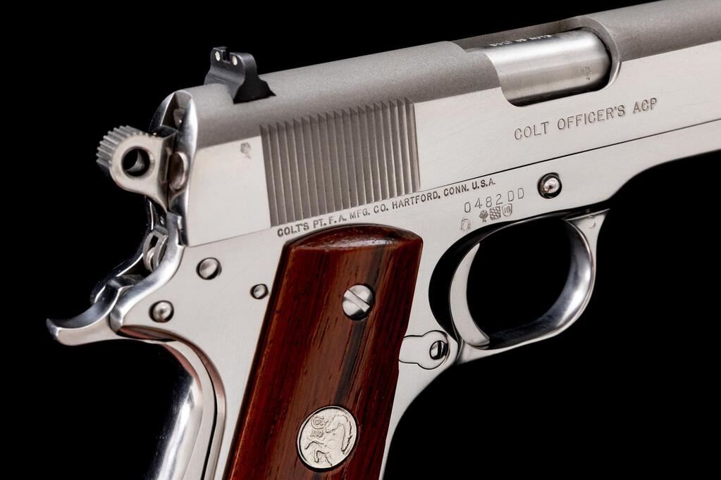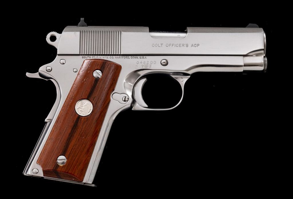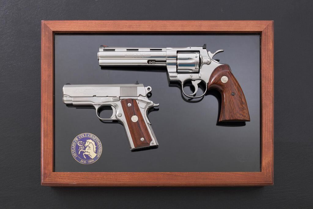 Scarce Colt Double Diamond Matched Set with German Proof Marks, Presentation Case and Boxes. This 150th Anniversary set was limited to a production of only 1,000 and includes both a Colt Python revolver and Officer's ACP pistol. 1.) Colt Python Double Action Revolver, #DD0482, .357 Mag. cal., 6" vent rib barrel, "Ultimate" bright stainless finish, rosewood grips with silver 150th Anniversary Colt medallions, red ramp front sight, and fully adjustable square-notch white outline rear sight. Left side of barrel is marked "Double Diamond" and has a small German "(eagle)N" proof mark. There are also German proof marks stamped on the inside of the frame above the serial number and back of the cylinder. Condition is near excellent retaining approx. 99% factory bright stainless finish, which shows light scratching primarily on the frame. There are also other handling marks that are consistent with those found on a bright stainless finish. Right side, lower portion of the frame has a few tiny specks of finish loss that are likely due to being stored in the display case. Factory lettering is crisp. Grips are excellent overall; right grip has a few light handling marks. There is very faint turn line on the cylinder, mild burn rings on the face, around every other chamber. Bore is excellent. 2.) Colt Officer's ACP Semi-Automatic Pistol, #0482DD, .45 ACP cal., 3.5" barrel, bright stainless finish, smooth rosewood grips with silver 150th Anniversary Colt medallions, white 3-dot sights, with one stainless Colt magazine. Left side of slide is marked "Double Diamond". German proof marks are located on right side of the barrel, frame, and slide. Condition is excellent. Showing intermittent light handling marks, the largest are on the front grip strap. Moderate rub marks to exposed portion of the barrel at the chamber. Factory lettering is crisp. Grips appear like new. Excellent action and bore. Both firearms come with their original matching numbered boxes, instruction manuals, and other misc. factory paperwork. Both boxes show moderate storage type wear and have clear end labels. Glass-topped wood Colt presentation case with black interior, includes the key and 150th Anniversary Colt medallion mounted to the inside. Case interior is excellent; exterior has a few shallow scratches and impressions. Est.: $7,500-$9,000. (Modern/PPT)