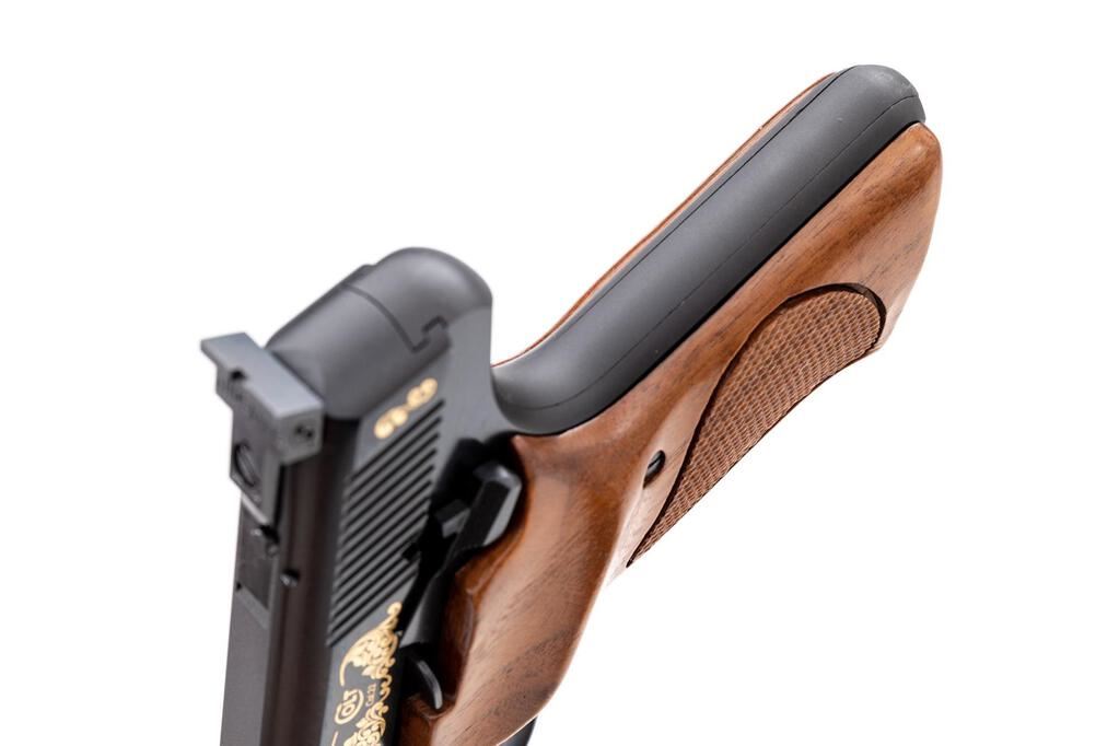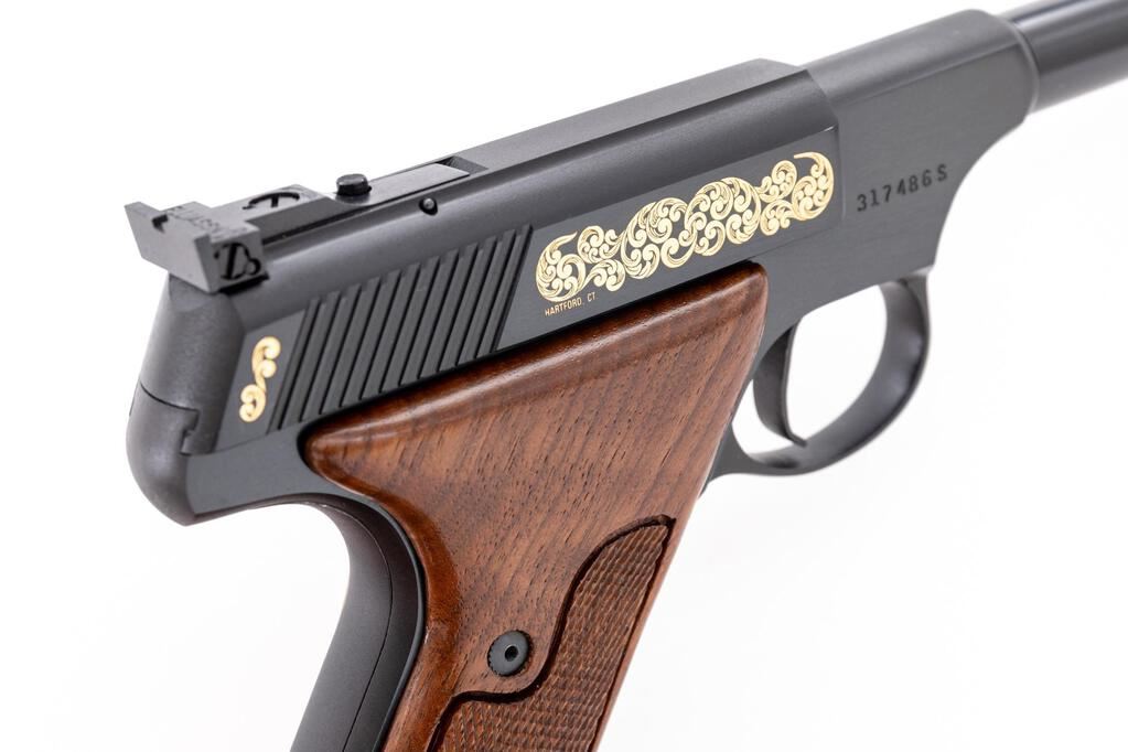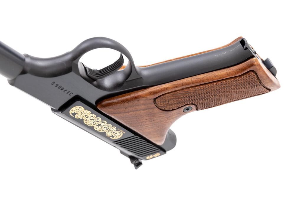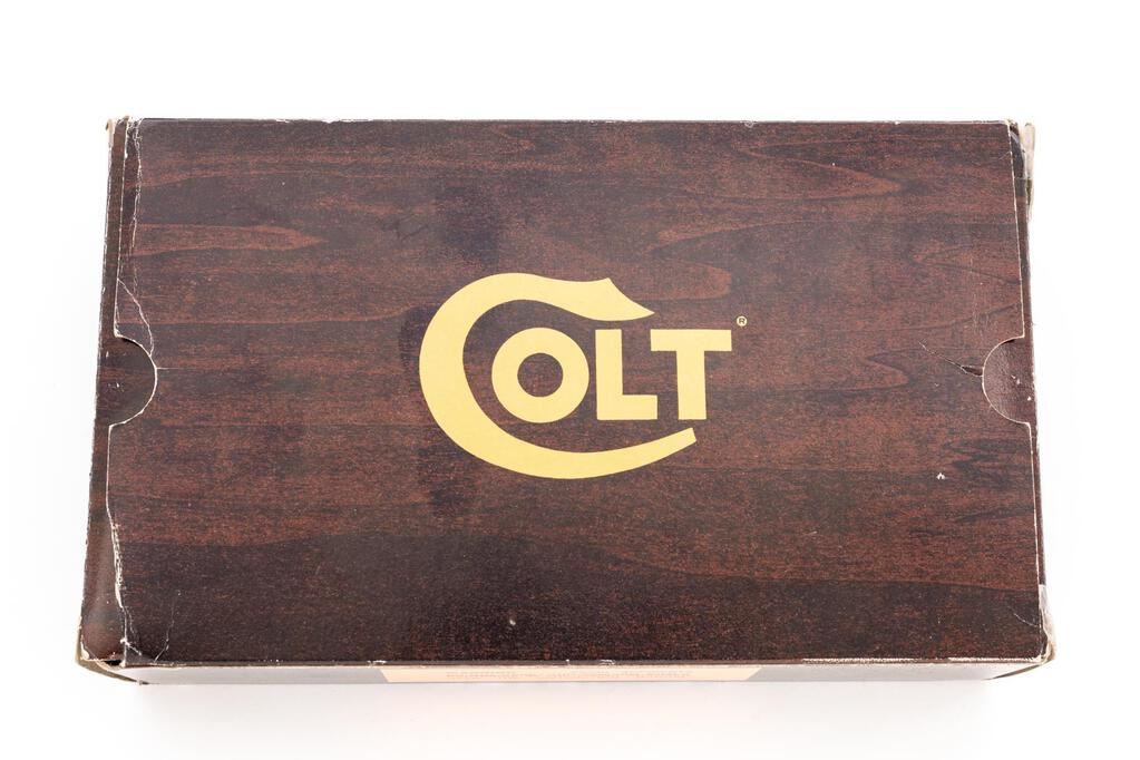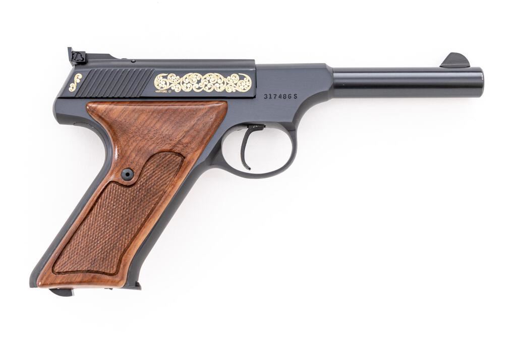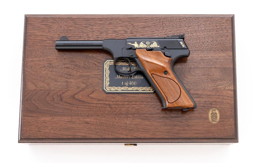 Scarce Cased Colt Huntsman Model S Master Series Semi-Automatic Pistol, #317486S, .22 cal., 4.5" barrel, blue finish, with gold etched slide. Right-hand walnut grips with checkered grip panels; blade front sight and square-notched fully adjustable Elliason rear sight. Includes one Colt magazine. In original wood grain pattern Colt box, matching numbered Colt Custom Gun Shop label has become detached but is present, with instruction manual and misc. factory paperwork. In original Colt Custom Shop walnut display case with blue French-fitted interior and key. There is a plaque mounted to outside of the lid that reads "Model S / Master's Edition / 1 of 400." Approx. 285 were mfg'd like this example with a non-tapered Huntsman barrel. Pistol is in excellent overall condition, appearing unfired, with a few minor handling marks to the front strap. Grips are also like new with crisp checkering. Smooth action, mirror bright bore. One of the box end panels is torn and repaired with tape, otherwise showing normal light storage type wear, and some additional writing in pen. Wood case interior is like new. There are a few shallow scratches present on the outside of the lid. Est.: $1,500-$1,800. (Modern/PPT)