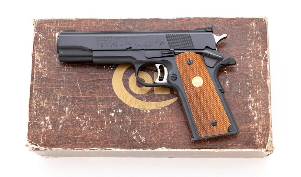 Colt MK IV Series 70 Gold Cup National Match Semi-Automatic Pistol, #70N36011, .45 ACP cal., 5" National Match barrel, dark blue finish, checkered walnut grips with gold Colt medallions, blade front and square-notched fully adjustable Elliason rear sight, skeletonized trigger, and blued steel Colt magazine. Mfg'd 1976. In matching numbered wood grain pattern Colt box with two-piece Styrofoam insert and instruction manual. Condition is excellent, appearing little used, and retaining approx. 98% factory metal finish. Finish wear to the lower left edge of the slide accounts for most of the finish loss. Grips are like new with sharp checkering and bright gold-colored medallions. Action operates smoothly, excellent bright bore. Box shows age and wear with reinforcing tape at some of the edges and corners, end label is legible. Est.: $1,800-$2,400. (Modern/PPT)