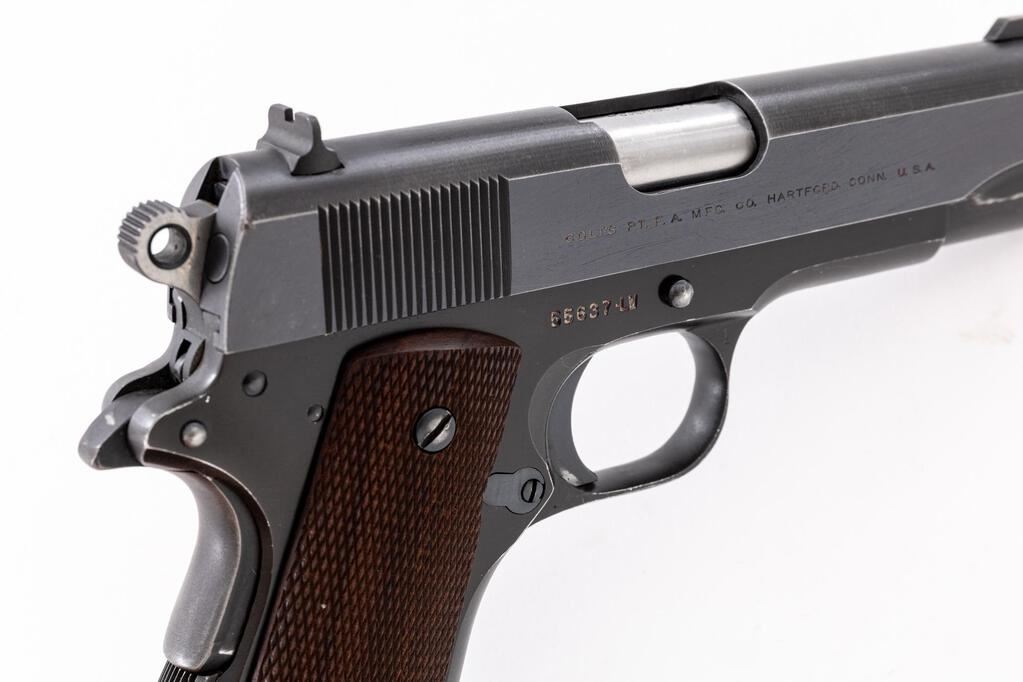 Colt Pre-Series 70 Lightweight Commander Semi-Automatic Pistol, #55637-LW, .45 ACP cal., 4-1/4" barrel, blue finish, alloy frame, checkered hardwood grips, standard blade front and square-notched rear sights. Includes one blued steel Colt magazine. Mfg'd 1968. Condition is good retaining approx. 90% factory blue, which shows some thinning; slide with mild plum colored toning. Metal with general light edgewear, handling marks, fine scratching to the slide. Wear to the front and back strap accounts for much of the finish loss. Factory lettering is clear. Grips are very good, checkering is primarily sharp, with a few moderate handling marks. Action is tight and operates smoothly. Bore is very good, bright, rifling shows typical wear but is still clearly defined. Est.: $1,000-$1,400. (C&R/PPT)