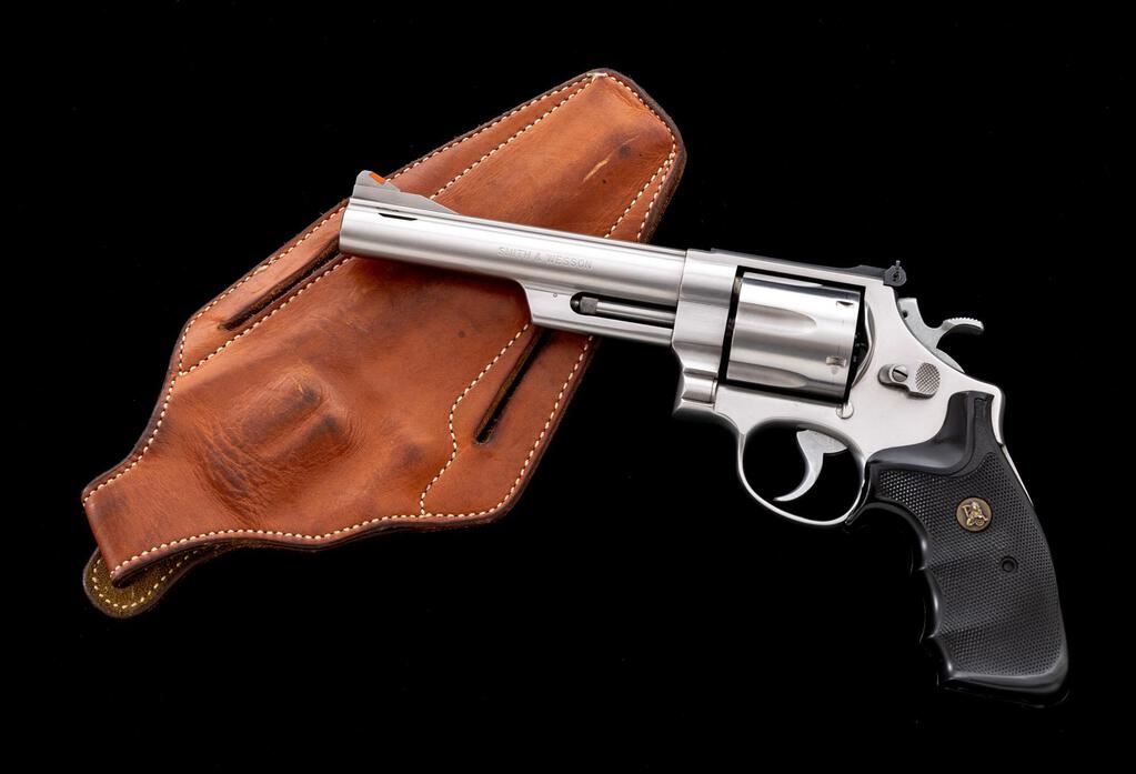 Smith & Wesson Model 629-1 Ported Double Action Revolver, #AVY9608, .44 Mag. cal., 6" ported barrel, satin stainless finish, checkered black rubber Pachmayr grips, red ramp front sight and fully adjustable square-notched with white outline rear sight, smooth target trigger and checkered target hammer. Includes a right-hand brown leather Safariland holster. Condition is very good+ overall, showing signs of moderate use. Metal with scattered light scuffs and scratches. Grips are excellent but do not fit properly, leaving a portion of the backstrap visible. Action cycles smoothly, trigger pull is crisp, cylinder with a little rotational movement; near excellent bore, bright with well-defined rifling. Holster shows moderate age and wear, with some scuffs, scratches, and darkening to the leather. Est.: $900-$1,200. (Modern/PPT)