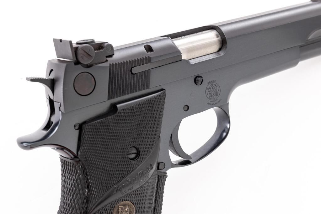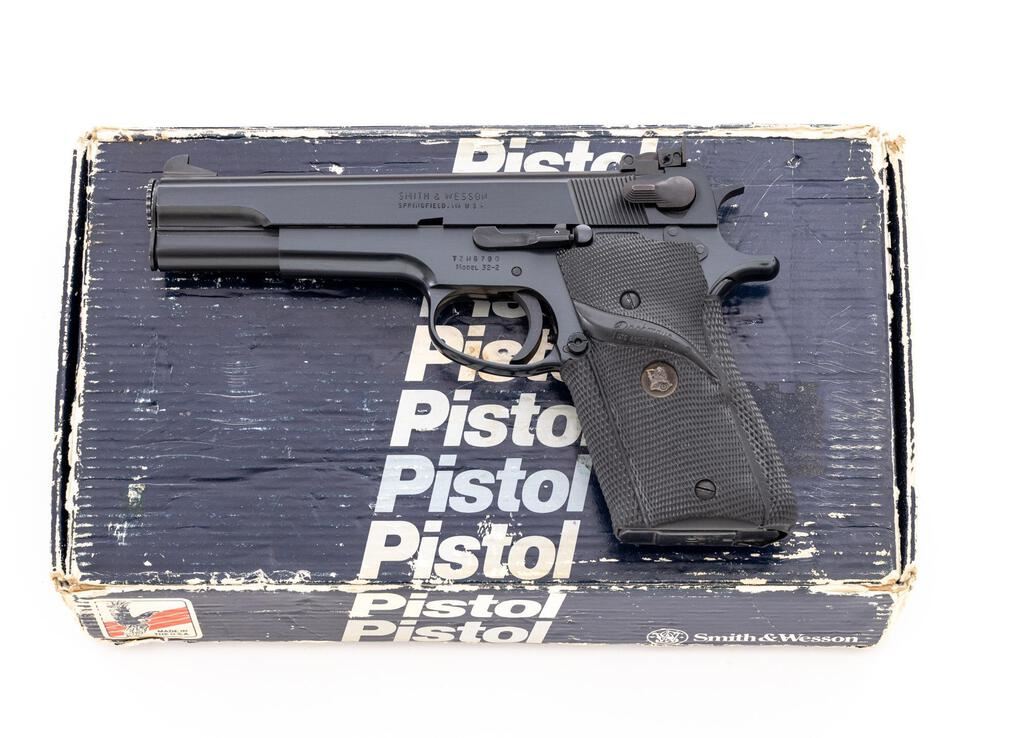 Smith & Wesson Model 52-2 Semi-Automatic Pistol, #TZN6790, single action, .38 Spec. Mid-Range Wadcutter cal., 5" barrel, blue finish, checkered black rubber Pachmayr grips, Patridge front sight, square-notched rear sight is adjustable for windage and elevation, with one blued steel S&W magazine. Includes the original matching numbered box, cleaning accessories, and barrel bushing wrench. Pistol is in excellent overall condition retaining approx. 98%+ factory metal finish, with crisp factory lettering and only a few very minor handling marks. Grips are very good showing moderate handling wear. Action operates smoothly; excellent bore, bright with well-defined rifling. Box shows considerable age and wear. Est.: $900-$1,300. (Modern/PPT)