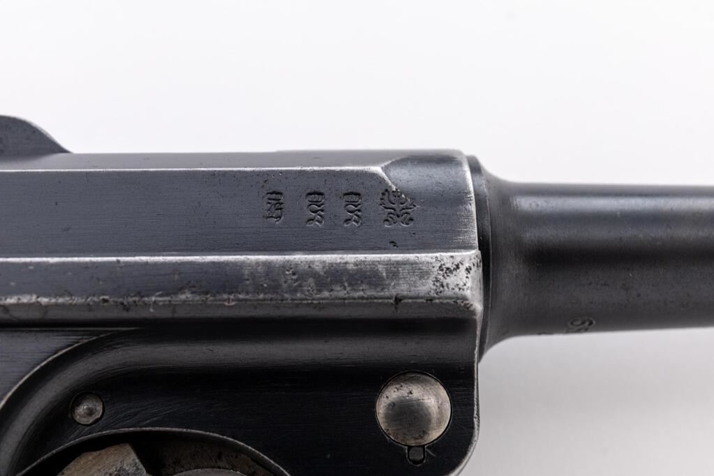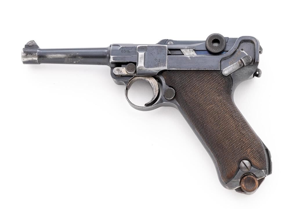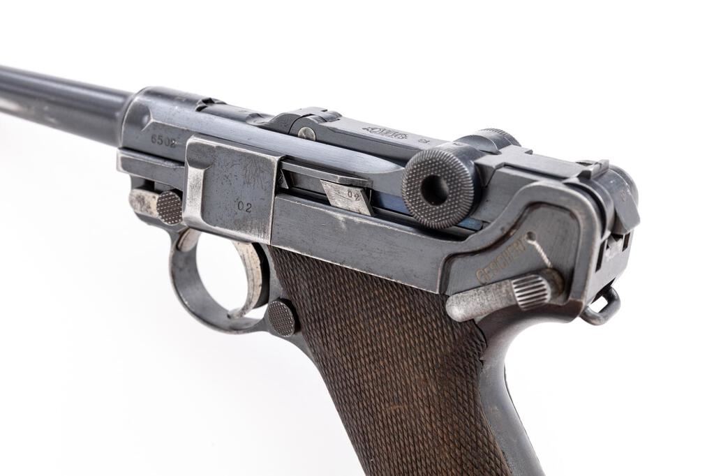 WWI German DWM 1916 P.08 Luger Semi-Automatic Pistol, #6502L, 9mm, 4" barrel, blued finish, straw and fire blued small parts, DWM marked toggle, chamber dated 1916, Imperial German firing and proof marks on right side of slide, stock lug, lanyard loop, drift adjustable inverted "V" front sight, integral fixed rear sight with small "v" notch, checkered wood grips, and one nickel-plated steel magazine with an unmarked wood base. All visible numbers match, but the sear bar has been over stamped to force match it to the gun. Condition is good retaining approx. 75% original rust blued finish, with holster wear on the sides of the muzzle, front of frame, front of slide, sideplate high edges, frame high edges, trigger guard edges, minor pitting on right front frame, sides and bottom of barrel has several large scratches. Front grip strap is very strong with just light freckling, rear grip strap shows wear from use, wear around the stock lug, mag well area, top of rear toggle, and firing marks at rear top of frame. Straw-finished small parts show wear and fading to the finish with scattered freckling. Action, hold open, and safety all function properly; bore is dark and heavily pitted, with worn lands and grooves. Grips show wear, soiling, and a few small scratches and gouges, and are correctly marked inside with the last two digits of the serial number. Grips fit the frame nicely with a minimum of movement; grip screws show thinning to the finish, with clean slots. Magazine body shows some rust, losses to the nickel plating, and wear from use; wood base shows no signs of ever being marked with numbers or proofs, shows age and light gouges around the side roundels. Est.: $800-$1,200. (C&R/PPT)