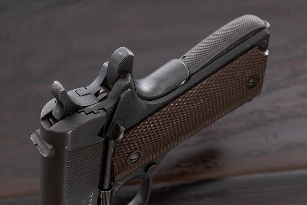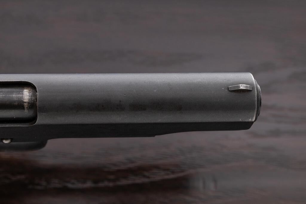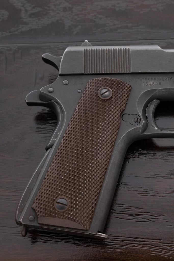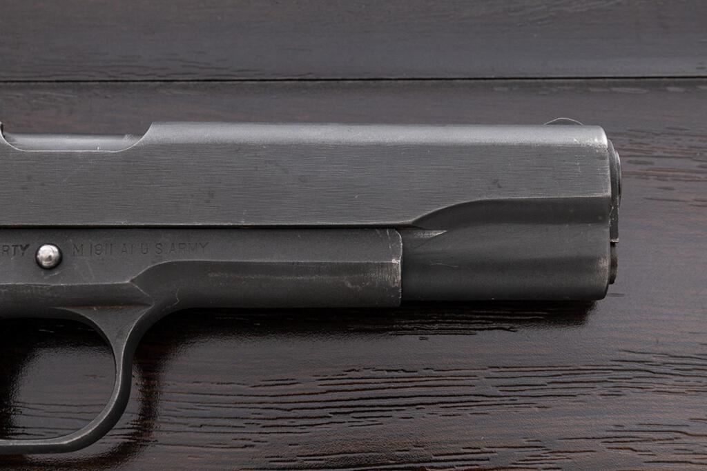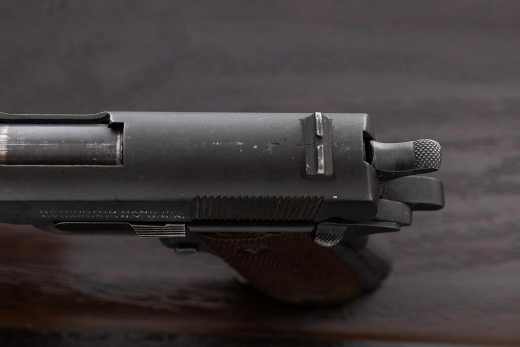 WWII Remington Rand 1911-A1 Semi-Automatic Pistol, #954303, .45 ACP cal., 5" barrel, Dulite black oxide finish, black-finished small parts, serial range for 1943 production, fixed thin blade front sight and drift adjustable fixed rear sight with small square notch, grip safety, checkered arched mainspring housing, lanyard loop, stamped steel trigger, slide marked with Remington Rand Inc. and address, small "P" proof on top of slide, FJA inspector's stamp on side of frame with "P" proof, crossed cannons proof mark, U.S. Property mark, and M 1911 A1 U.S. Army mark. Dulite black-finished barrel is marked with HS and P on the lugs, checkered brown plastic grips, and one black-finished General Shaver spot welded steel magazine. Condition is excellent retaining approx. 93% original finish, with light holster wear on the front edges of the slide, front edges of the frame, tops of the sights, light wear marks from use on the grip safety sides, hammer, and trigger, slight thinning of the finish on the safety lever and hold open lever high edges. Left side of the slide near the mfgr's markings has some wear to the finish. Typical scratches and wear on the frame by the hold open lever from disassembly. Barrel shows wear on the top chamber area from use and very light wear on the body, with mint bore. Action, hold open, and safeties all function properly. Grips are very nice, the grip screws show very light high edgewear, with clean slots. Magazine shows a two-toned finish, the top being black, the bottom with a brown plum-colored finish, with light wear marks on the body from use. Est.: $1,500-$2,000. (C&R/PPT)