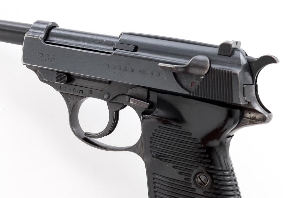 WWII German P-38 ac-43 Semi-Automatic Pistol, with Holster, #1956m, 9mm, 5" barrel, blued finish, double action, Nazi eagle firing proof on slide, "(eagle)359" waffenampts on frame and slide, hammer drop safety, drift adjustable replacement blade front sight and fixed rear sight with small "u" slot, all visible numbers matching, lanyard loop, bottom mag release, black plastic grooved grips, two (2) blued steel magazines marked "P.38v", with small "(eagle)359" proof on rear spine. In black hard shell P-38 holster. Condition is good retaining approx. 80% original blued finish, with wear to the bluing on the barrel muzzle and sides, light wear spots on top of barrel at chamber area, sides and top of the slide, front of the frame and trigger guard. Front grip strap is thinning to gray with light freckling; rear frame lug is thinning to gray, wear to the tops of the sights, and tips of the safety and hold open levers. Rear frame lug, lanyard loop, mag release lever, and bottom of the magazine show heavy rust pitting that has been cleaned. Magazine in the gun has the pitted bottom plate, wear and mottling to the finish, and lines from use. Magazine in the holster is very nice, showing just the slightest use and minor wear marks. Action, hold open, and hammer drop safety all function properly; bore is bright and shiny. Grips show light wear, some scuffs, and scratches. Holster is marked on the back "P-38", "eue43", and "(eagle)WaA300". Holster shows wear, scuffs, scratches, and minor cracking and crazing to the leather; the internal pull strap is in good shape. Est.: $1,000-$1,500. (C&R/PPT)